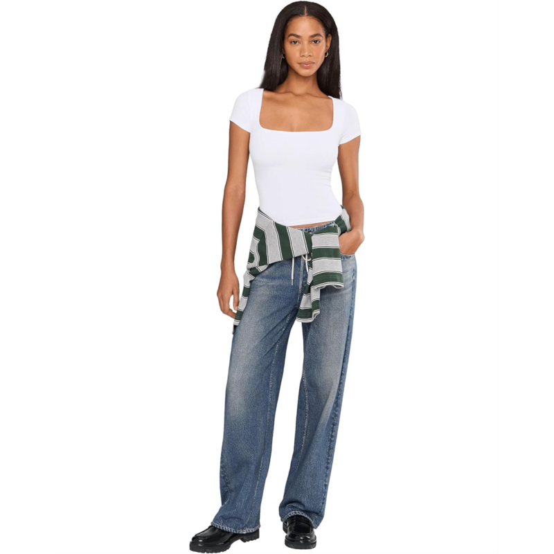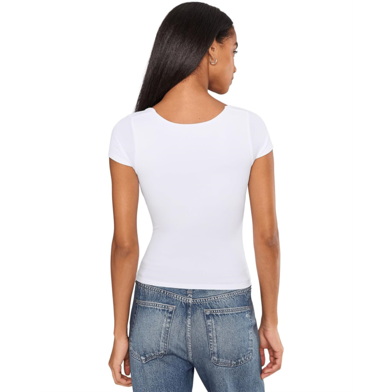 - Stay cool and stylish wearing the Free People Clean Lines Baby Tee! This breathable tee features a flattering square neckline and short sleeves, perfect for those warm-weather days. The fitted silhouette hugs your curves in all the right places, making it a wardrobe essential for any fashionista.