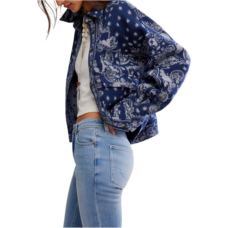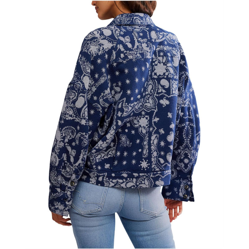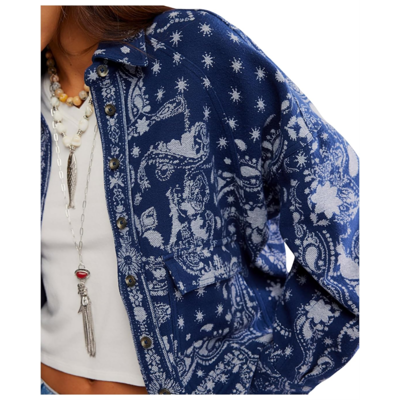 - Add a dash of style to your casual look wearing the Free People Bandana Jacquard Shirt. The collared shirt features a full-button closure, long sleeves with buttoned cuffs, an allover print, flap pocket on the front, and a straight hem.