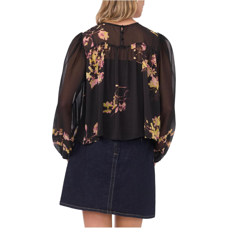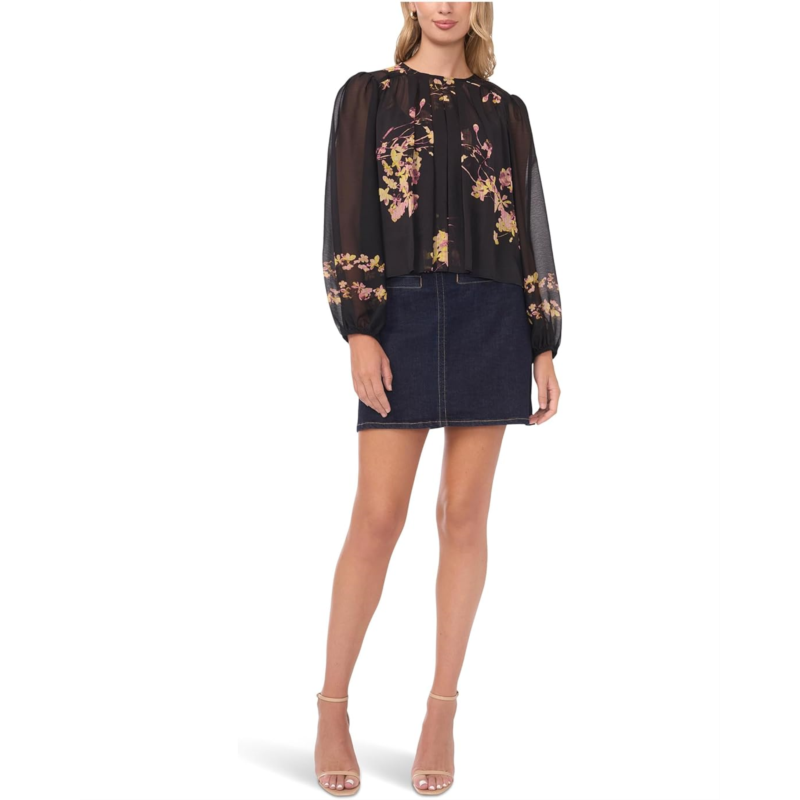 - From the desk to dinner, maintain your chic style in the Vince Camuto Round Neck Shirring Front Long. Featuring a round neckline with long sleeves, allover print and back button-and-loop closure.
