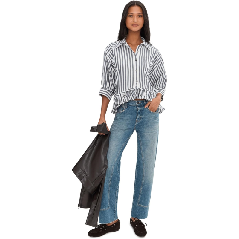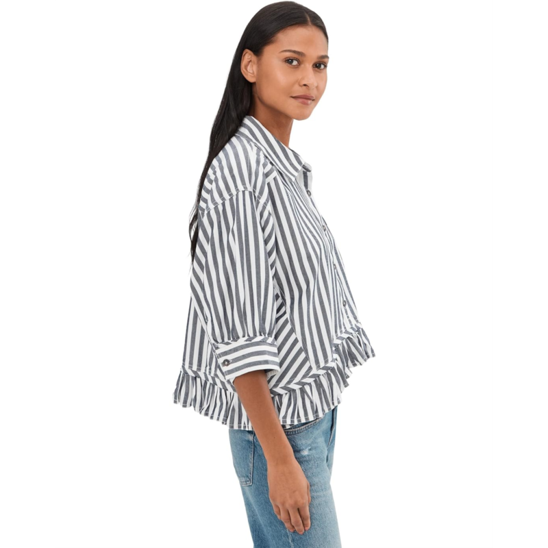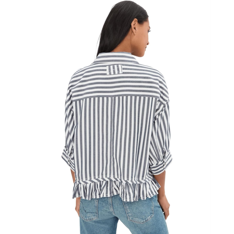 - A feminine take on the classic button-down, the Free People We The Free Bailey Stripe Shirt is featured in a striped fabrication and collared-neckline with three-fourth sleeves. The button-front shirt has buttoned cuffs and a ruffled hem.