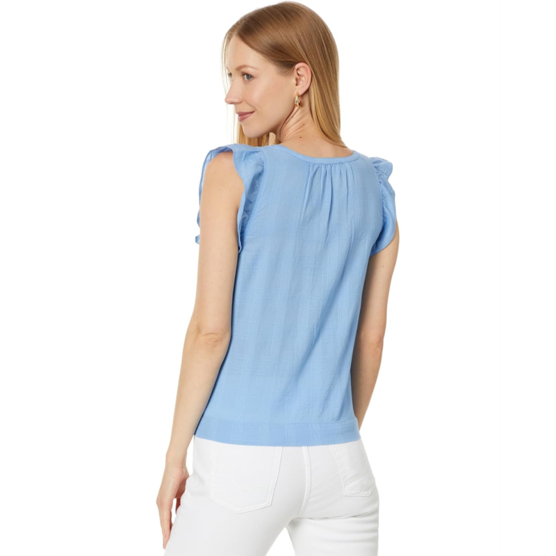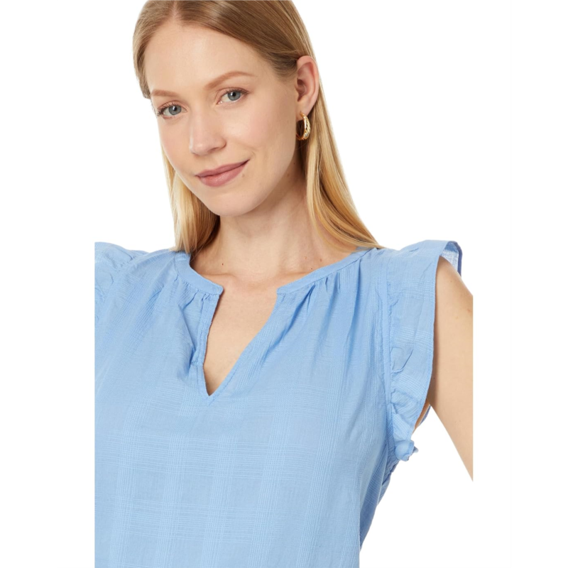- Cherish moments with luxury and style wearing the Lilla P Flutter Sleeve Split Neck Top. It features a split V-neckline, short flutter sleeves, and woven windowpane pattern throughout.