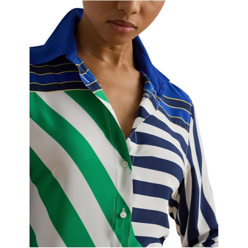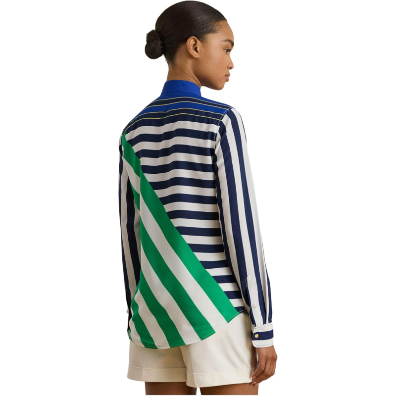 - Crafted from lightweight crepe de chine, this Lauren Ralph Lauren Classic Fit Striped Crepe Shirt is updated for the season with color-blocked variegated stripes. Its buttoned front placket with buttons custom-developed with a Lauren Ralph Lauren logo rounds out the design. Styled with an allover striped pattern, this button-down shirt has long sleeves, buttoned barrel cuffs, dropped shoulders, a point collar, a back yoke, and a shirttail hem. It also features metal buttons custom-developed with an LRL logo at the collar and cuffs.