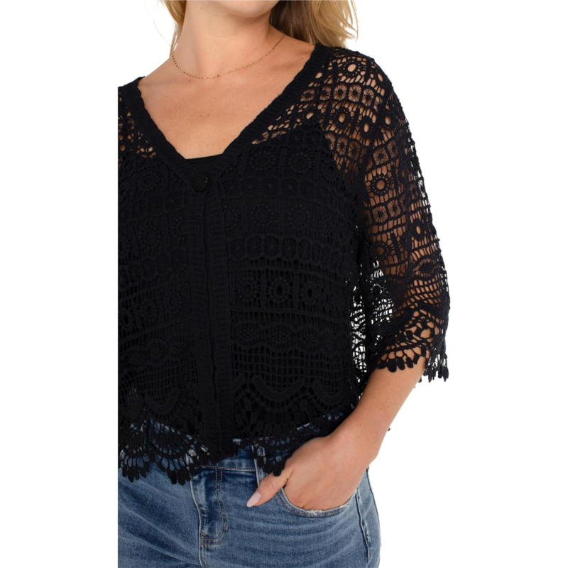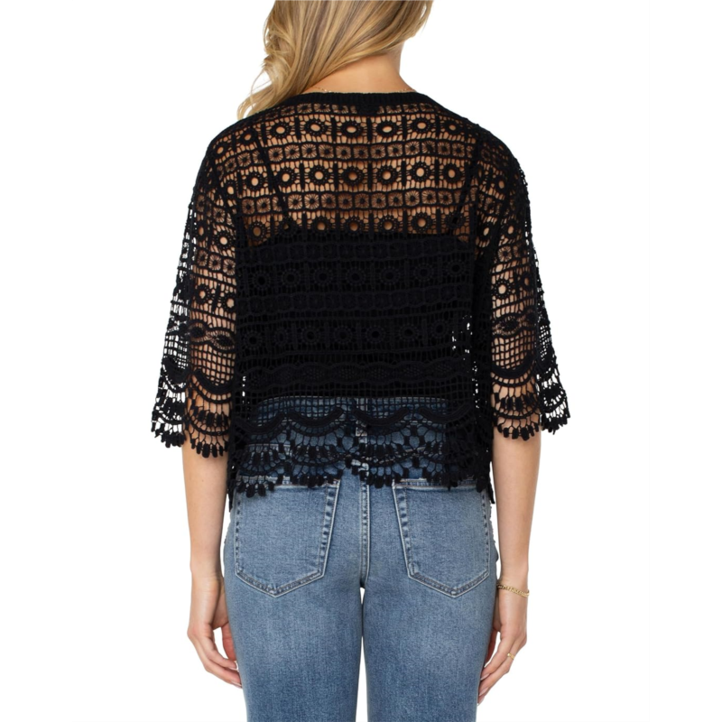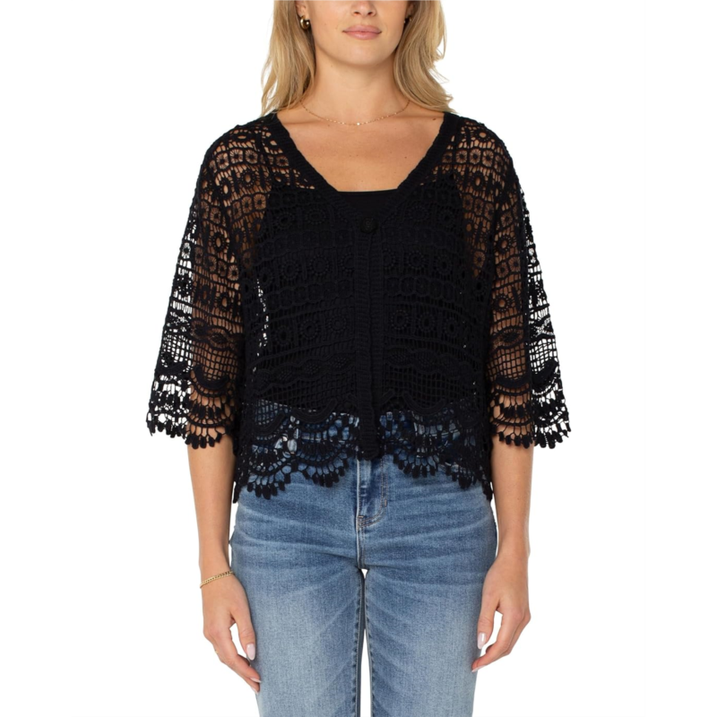 - Give your style statement a fashionable update by opting for Liverpool Los Angeles Short Sleeve Lace Bolero Top. The top features a V-neckline, lace-trimmed short-sleeves, signature button closure, and delicate scalloped edges for added style.