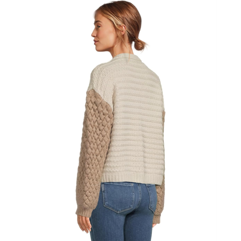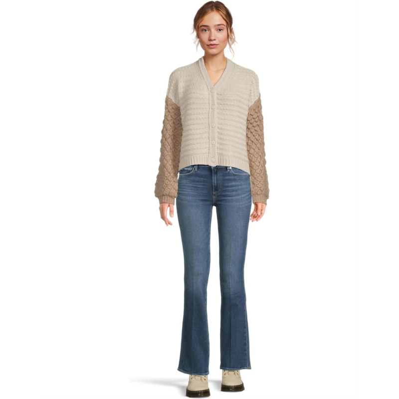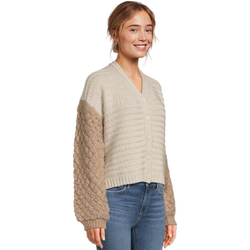 - The Splendid Maria Bobble Cardigan is where comfort meets contemporary charm. Crafted with a playful bobble-stitch texture and a soft two-tone colorblock design, this cardigan brings a fresh, tactile appeal to your everyday look. The deep V-neckline and button front closure create a flattering, feminine shape thats easy to style, wear it solo for effortless polish or layer it over your favorite tee or dress for cozy sophistication. With its slightly cropped, boxy fit and long sleeves, the Maria Cardigan perfectly balances relaxed comfort with standout style.