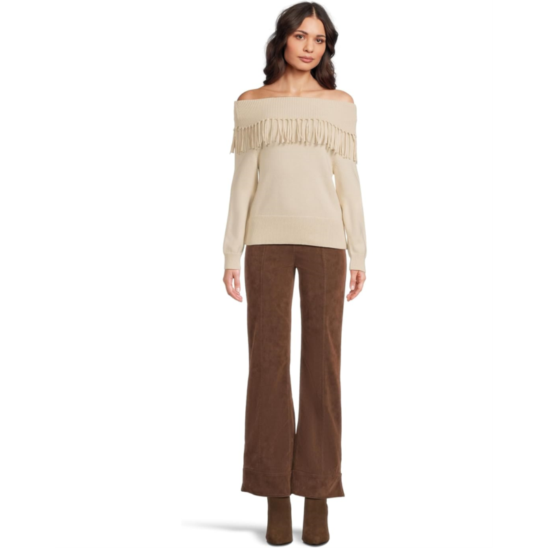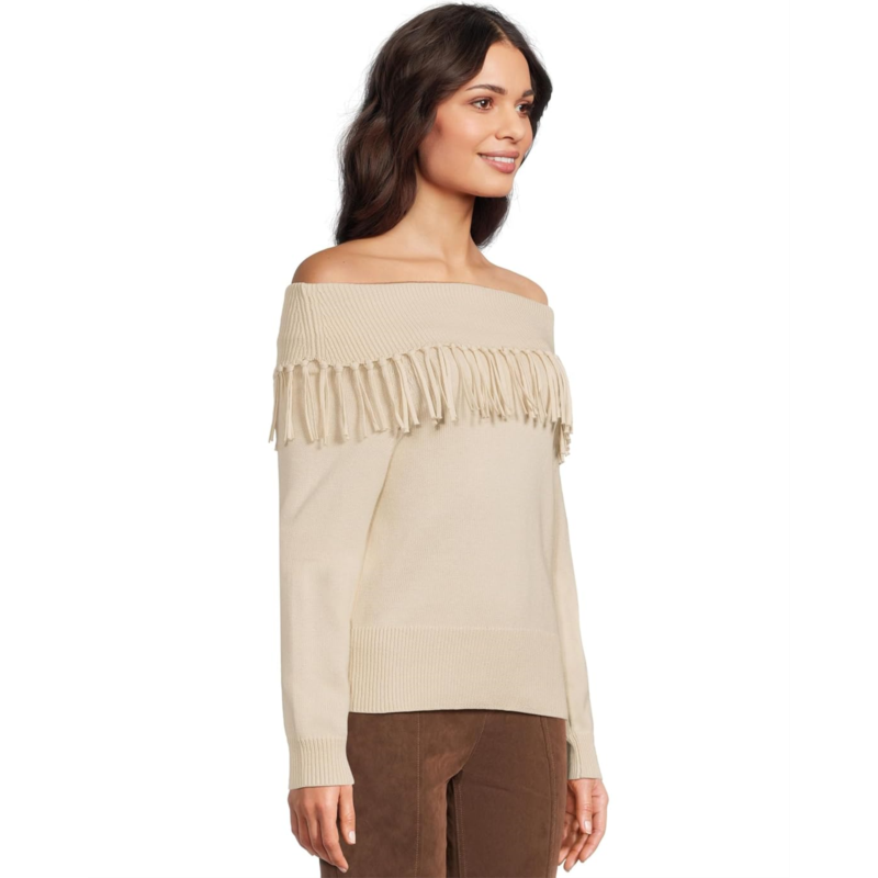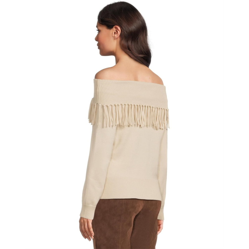 - The Simone Fringe Sweater combines softness and statement with a wide off-the-shoulder neckline and bold fringe that wraps around the yoke. Designed to have a relaxed fit, this knit with Western-inspired edge makes for a fun addition to any sweater stack.