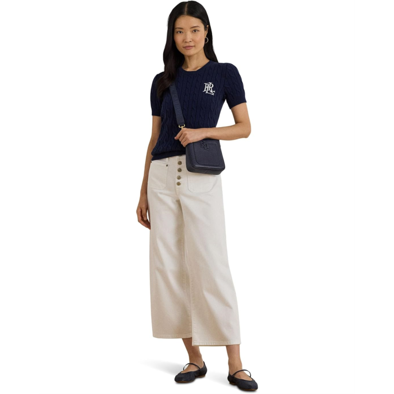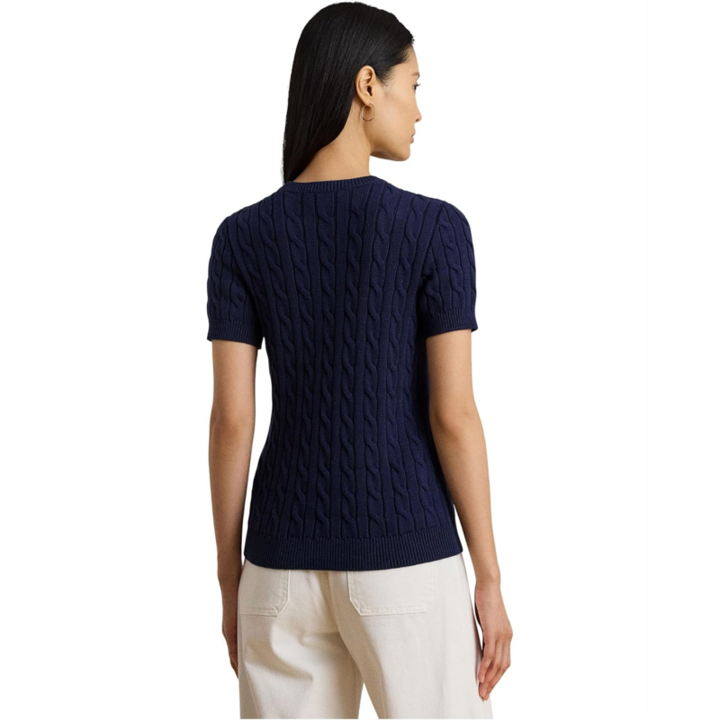 - Detailed with an LRL-embroidered logo at the chest, this Lauren Ralph Lauren Cable-knit Cotton Short Sleeve Sweater is perfect for transitional dressing with its short-sleeve design and lightweight combed cotton fabrication. It is styled with ribbed cuffs, a ribbed crew neckline, and a ribbed hem. Stay cozy and stylish wearing this cable-knit pullover sweater.
