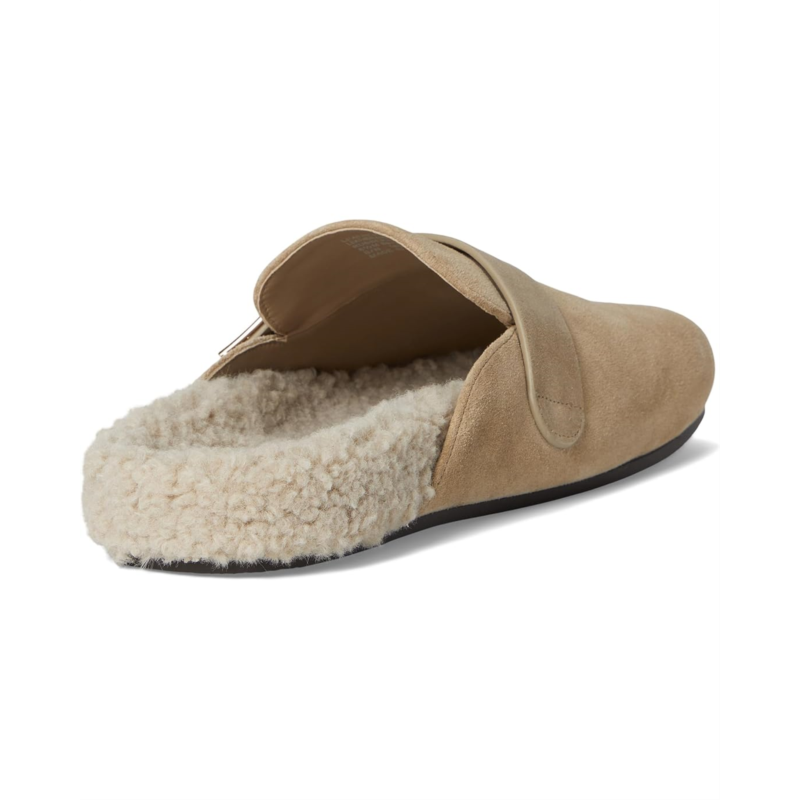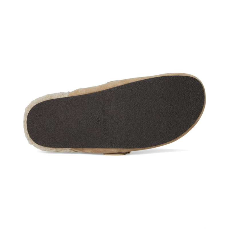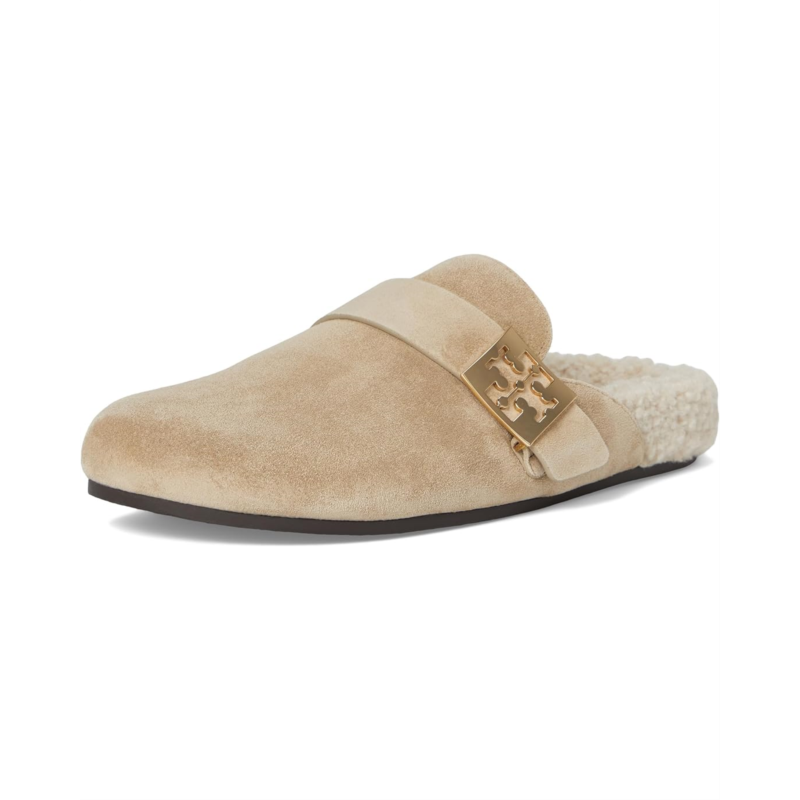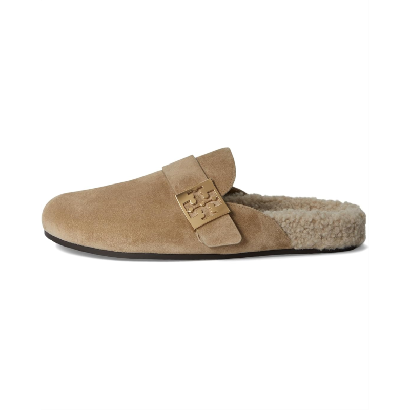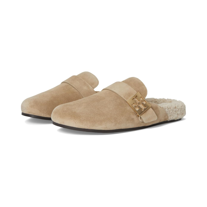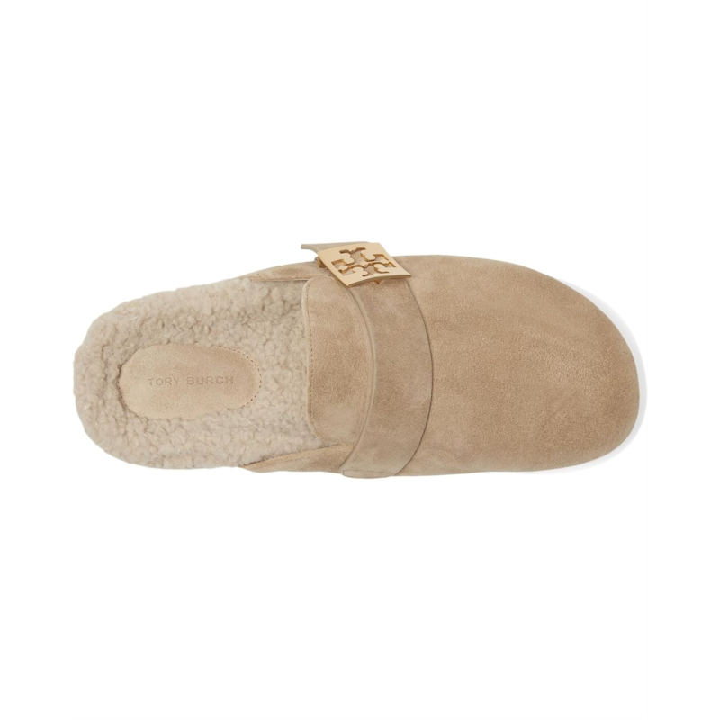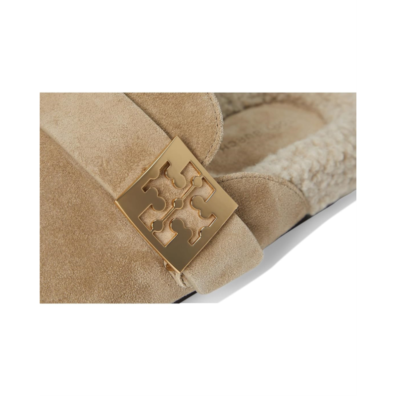 - Cozy and chic, a comfy click! Tory Burch Mellow Shearling Mule: slip into pure bliss. Crafted with a sumptuous suede upper, these mules offer a stylish twist with a belt design adorned with the iconic brand logo. The cozy polyester lining wraps your feet in warmth, while the plush leather insole provides superior comfort for all-day wear. Designed for effortless elegance, the slip-on style allows for quick transitions from home to brunch. With a durable rubber outsole, you can confidently stride on various surfaces.