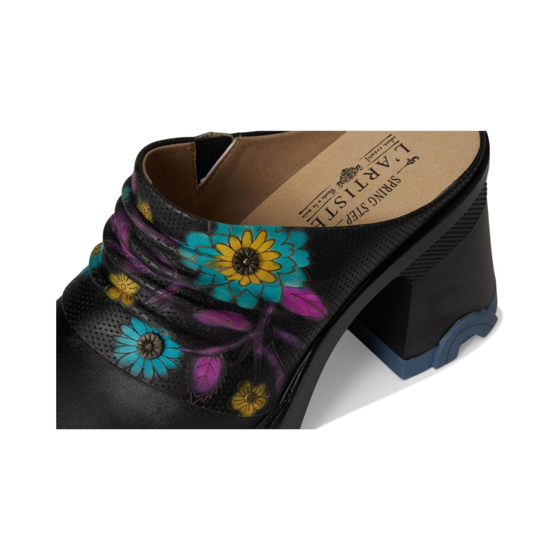- Step into bold confidence with this ultra-modern mule, blending edgy style with artistic charm. Crafted from premium leather, this statement shoe features hand-painted floral details, antique metal accents, and a unique ruched upper for a touch of effortless chic. The sculpted block heel and chunky sole provide both stability and attitude, while the cushioned insole ensures all-day comfort. A side zipper allows for easy slip-on wear, making this the perfect blend of fashion and function. Whether paired with jeans or a dress, this shoe exudes cool, contemporary style with a fearless edge.
