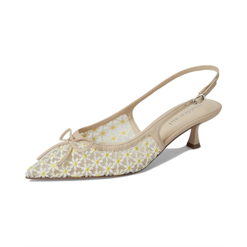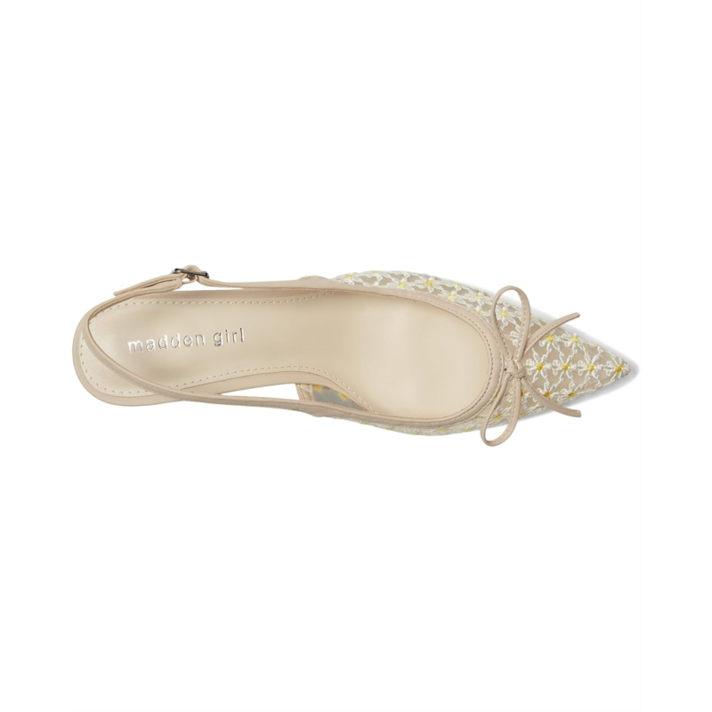 - Shine with style wearing the Madden Girl Vogue-M. Crafted from mesh upper, faux leather lining, and insole, this pair of sandals features pointed toe, kitten heel, slingback closure, and brand detailing on the footbed.