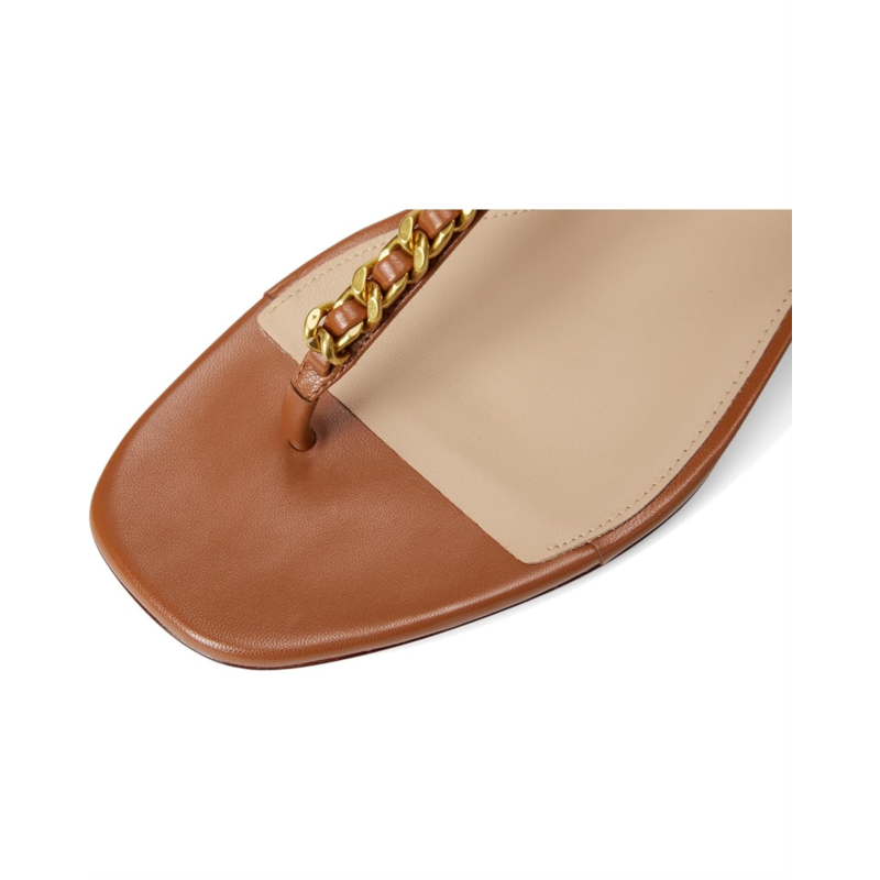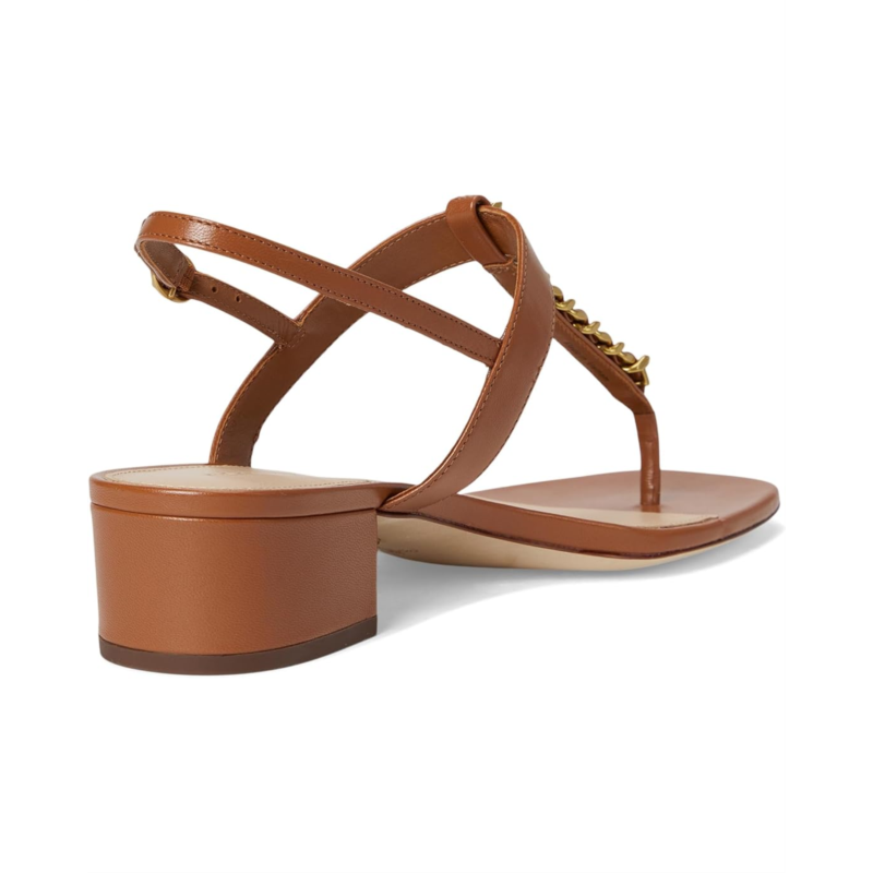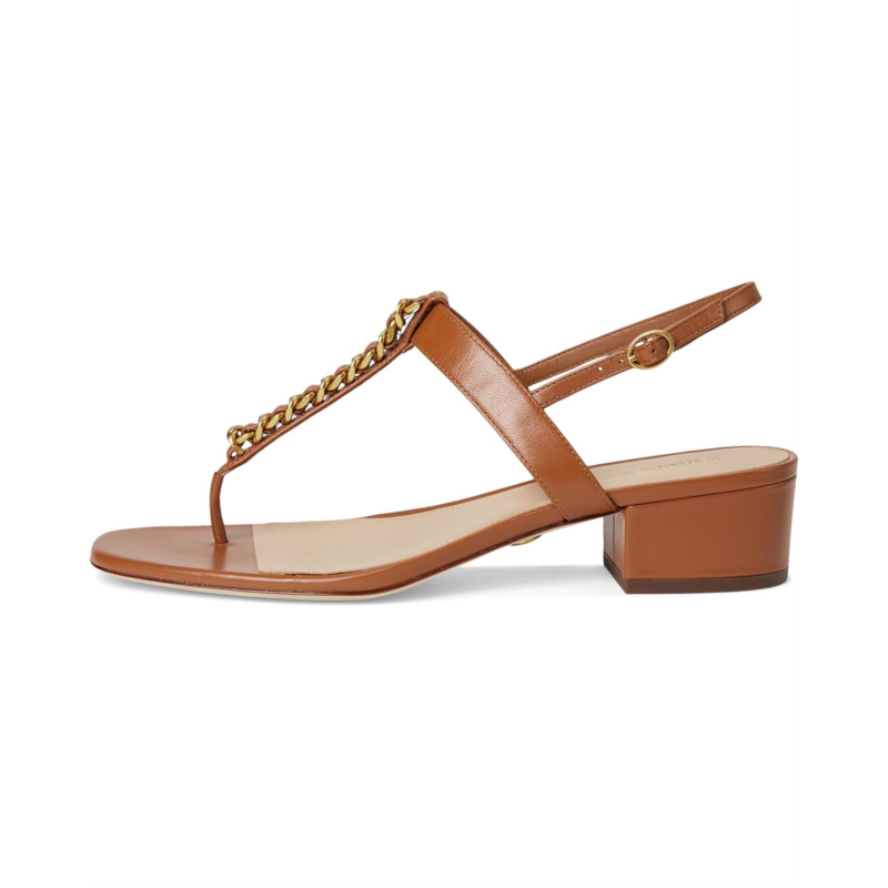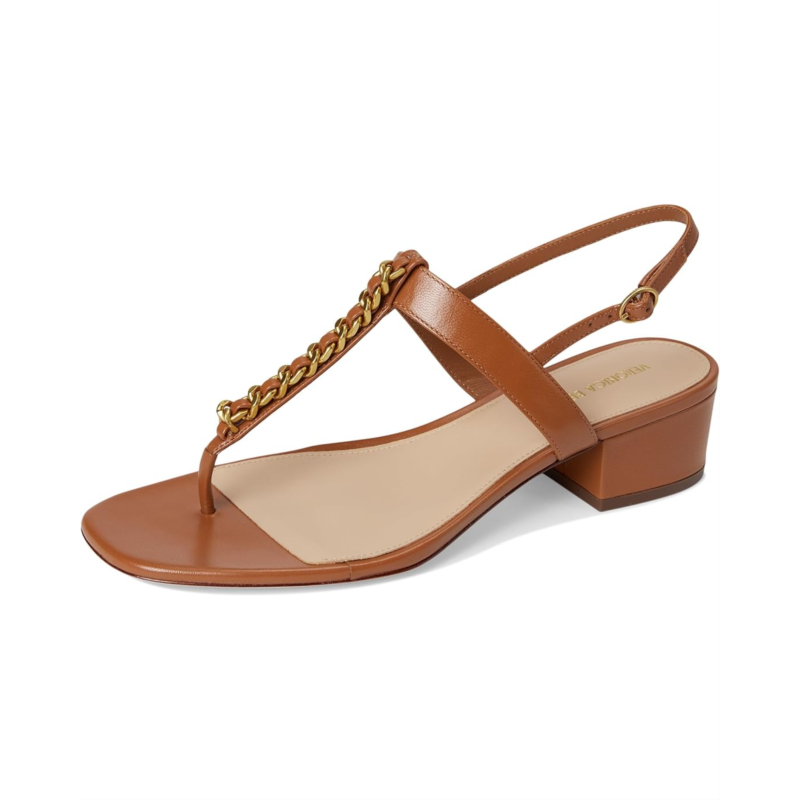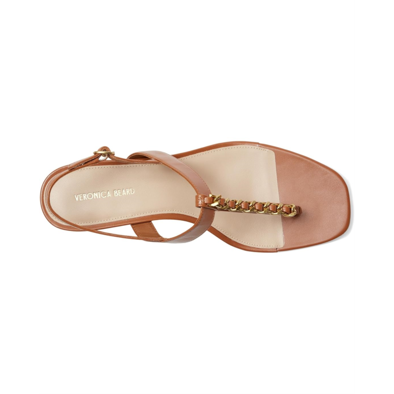 - The perfect vacation sandal, the Veronica Beard Andie Sandals bring a bold yet refined edge to your warm-weather style. Expertly crafted from leather, the Andie is a T-strap thong design accented with gold chain links down the front. A cushioned footbed completes the look. The chic block heel adds just the right amount of lift. Finished with a slingback strap and adjustable buckle, the Andie is a standout piece that effortlessly blends sophistication with a modern twist.