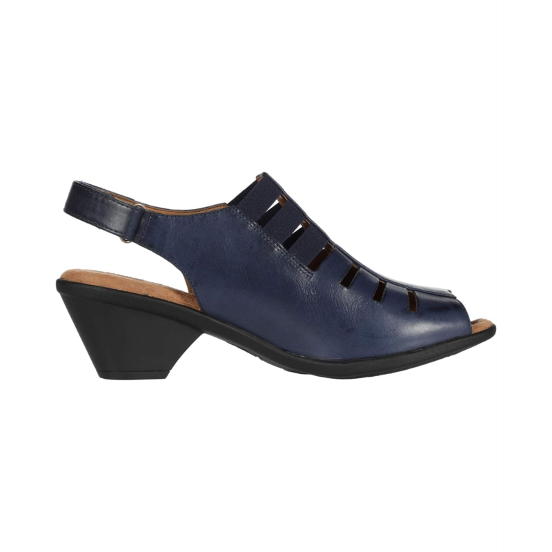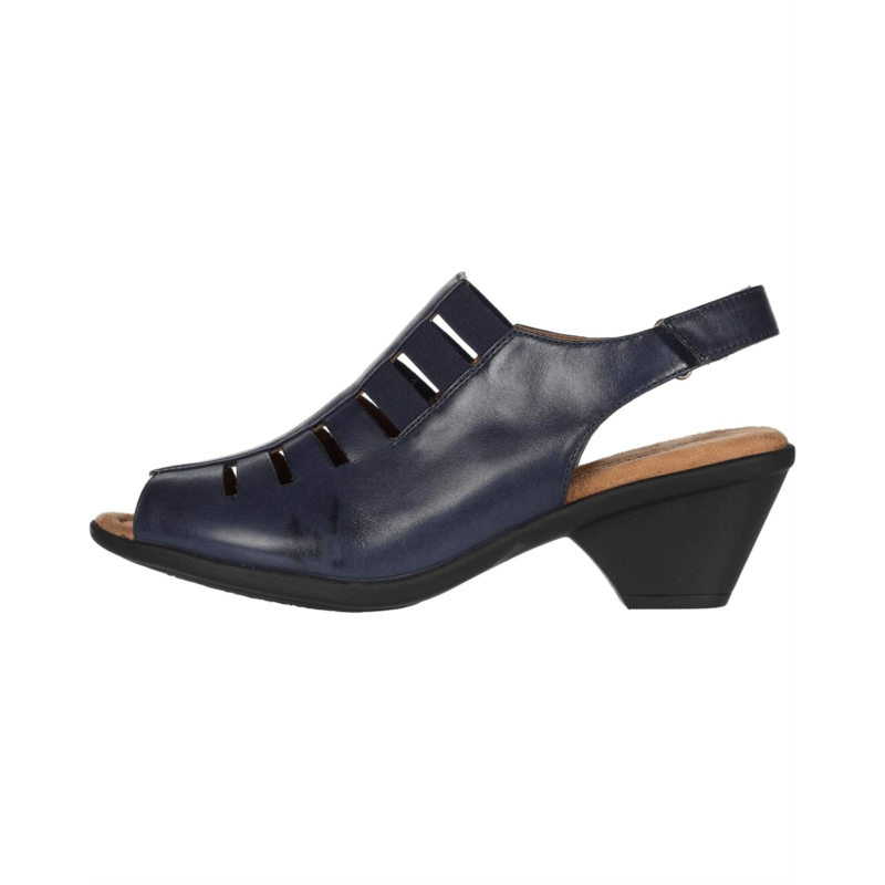 - Open heel features a slingback strap with adjustable hook-and-loop closure.