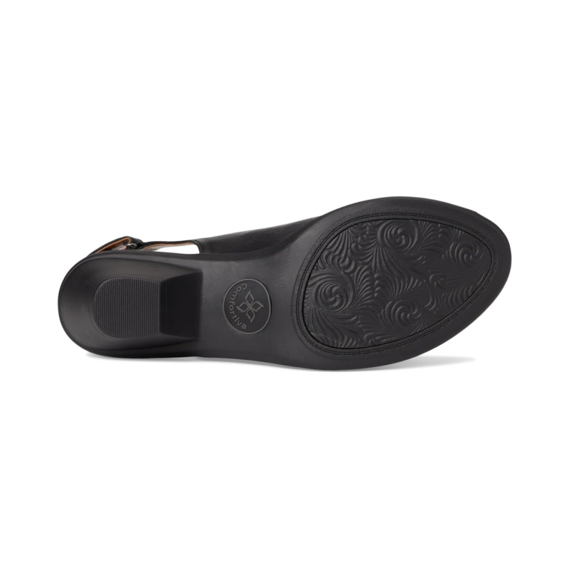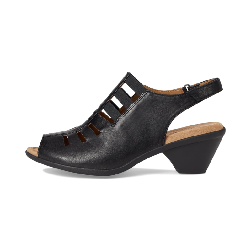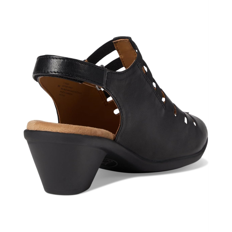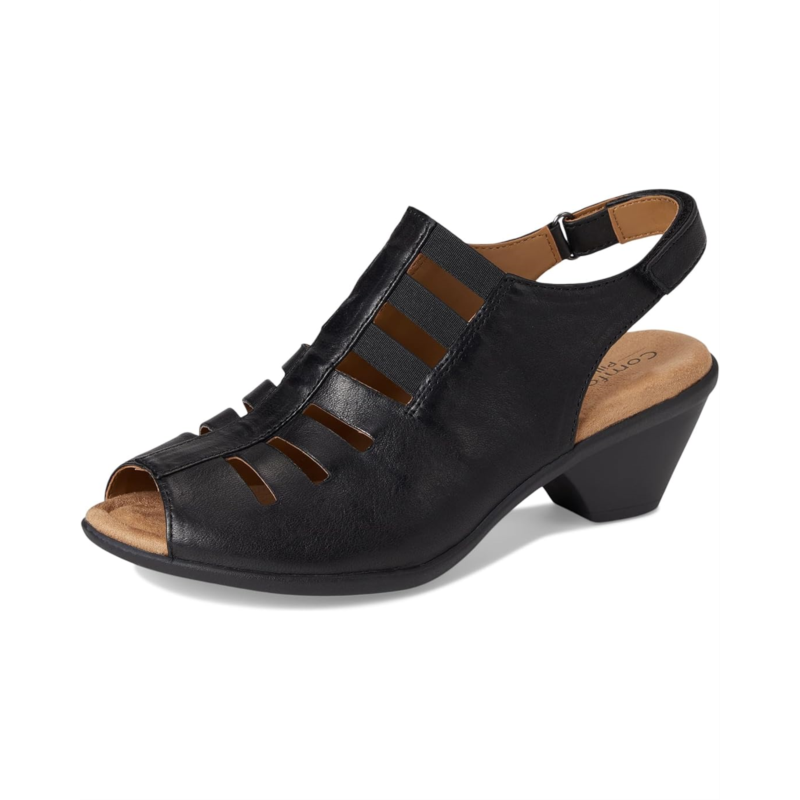 - Open heel features a slingback strap with adjustable hook-and-loop closure.