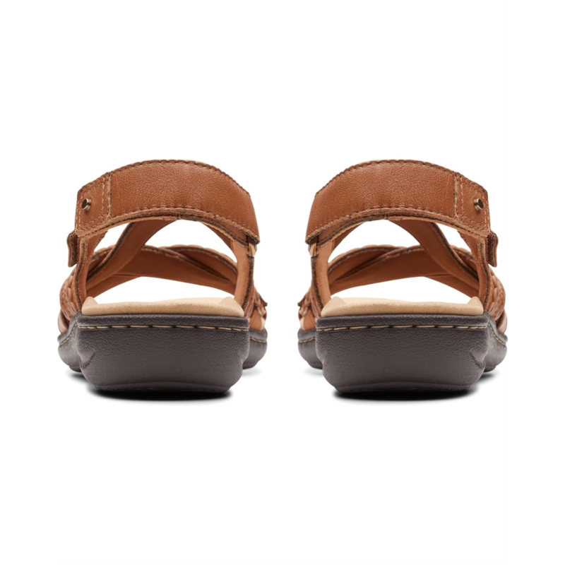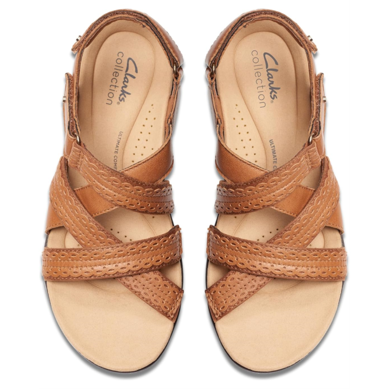 - Ideal for daily wear, the Clarks Laurieann Rena sandals are sure to accompany you wherever you go. It is crafted from leather upper, crossing vamp straps, and adjustable ankle strap with buckle closure. A mesh lining with rubber insole provide a cushion to cradle your feet. A contoured heel ensures you can walk unstoppable all day.