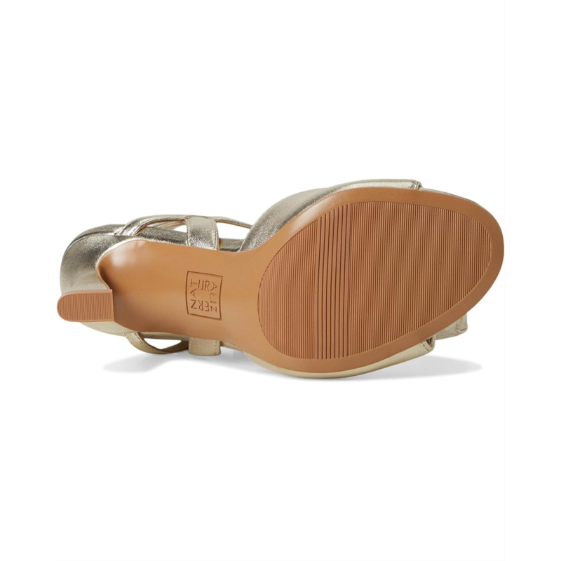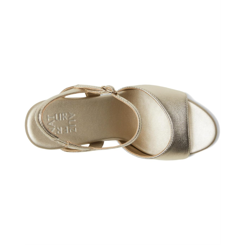 - Complete your party look in the Naturalizer Lala heels that elevate everything. Crafted from metallic leather upper, PU lining, and foam insole, this pair of sandals features round open toe, adjustable buckle closure, new contoured footbed with extra layer of padding, contoured shape, pressure distribution, less fatigue and longer wear for a next-level fit. Contour+ Comfort technology for a premium fit and all-day comfort experience, and stiletto heel.