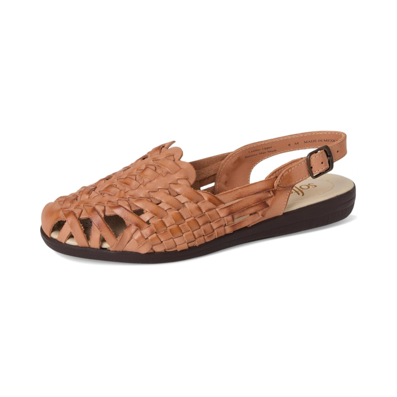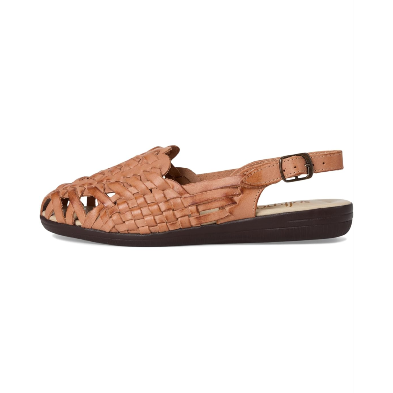 - Closed toe sandal with a slingback strap and buckle closure.