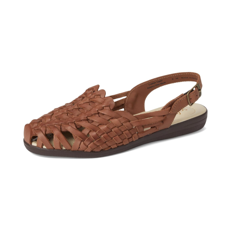 - Closed toe sandal with a slingback strap and buckle closure.