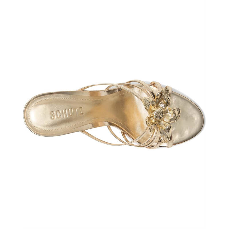- The Schutz Flora Mule is topped with a floral embellishment on the strappy front silhouette. This slip-on sandal features a leather upper, lining, and foam insole.