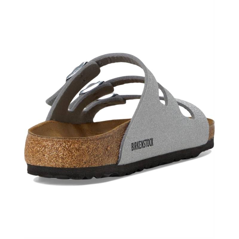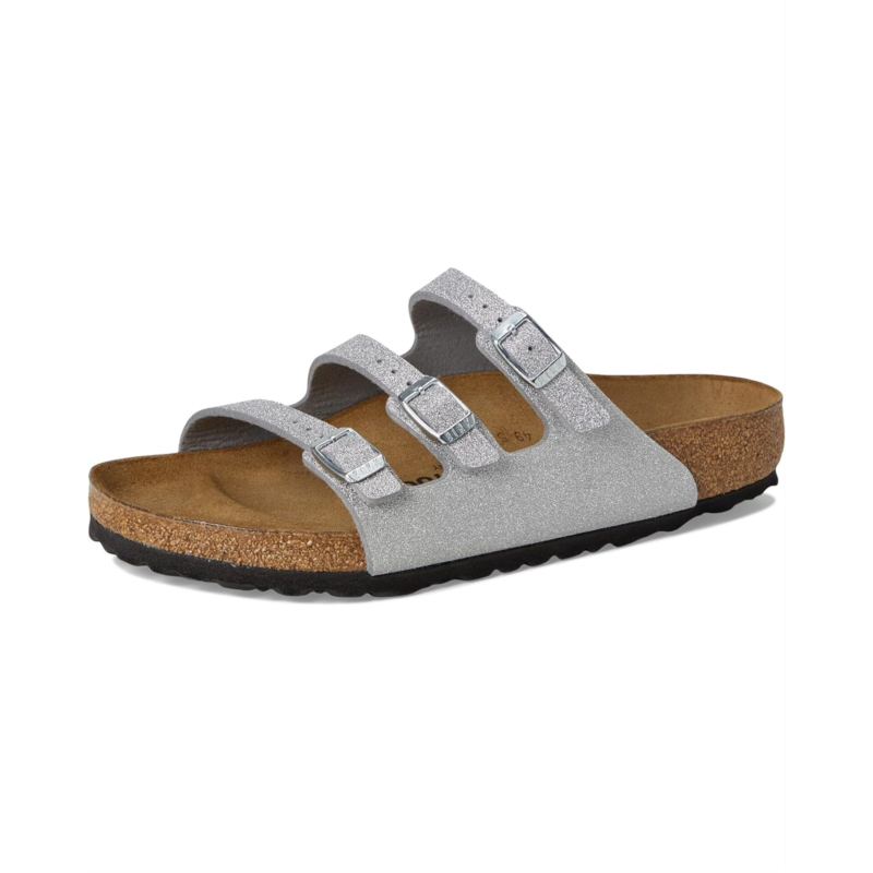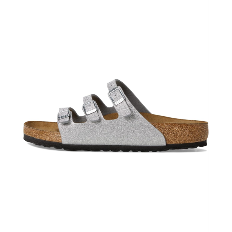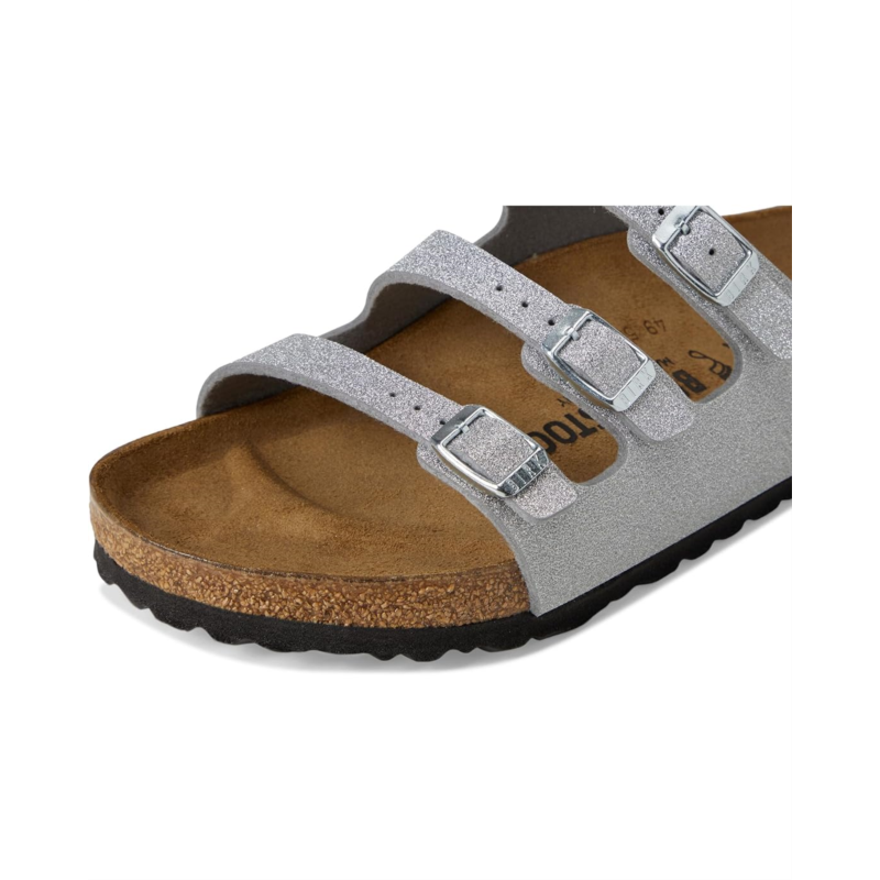 - Get the most out of your laid back looks in the Birkenstock Florida Shiny Glitter shoes. Featuring a round, open toe silhouette with a tear-resistant, skin-friendly upper and an anatomically correct footbed that is crafted from 100% renewable and sustainable cork for lasting comfort.