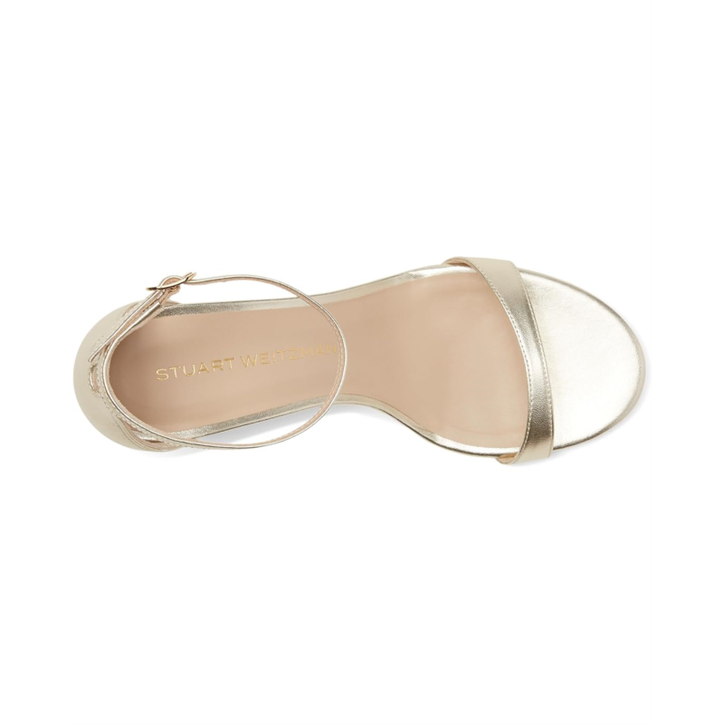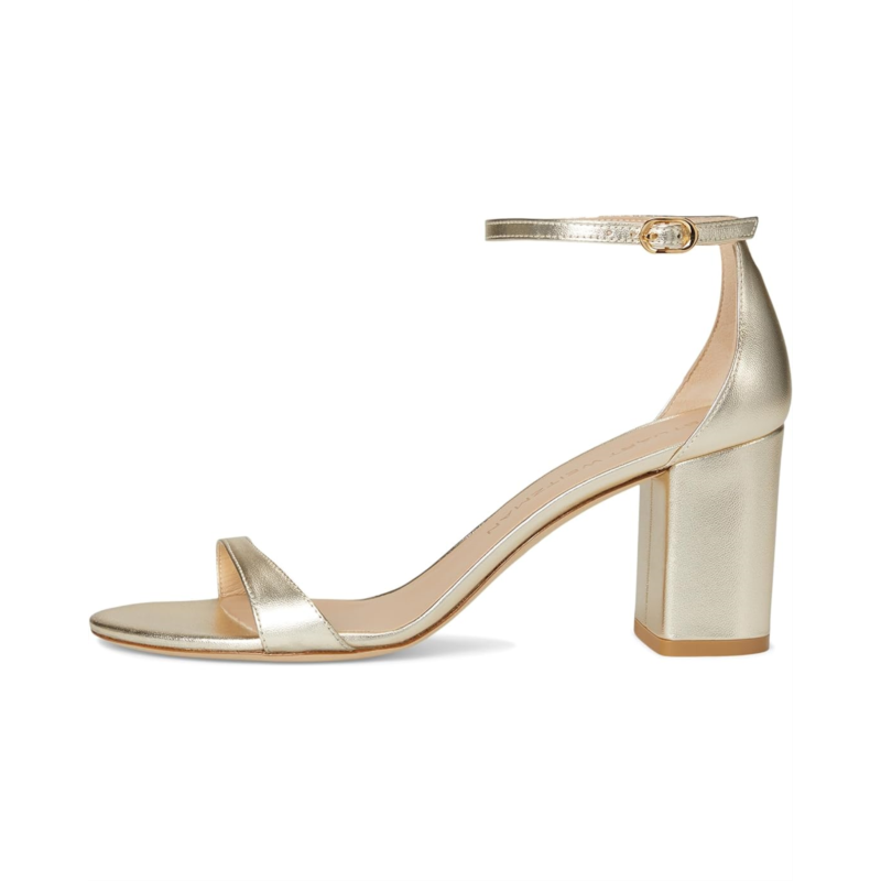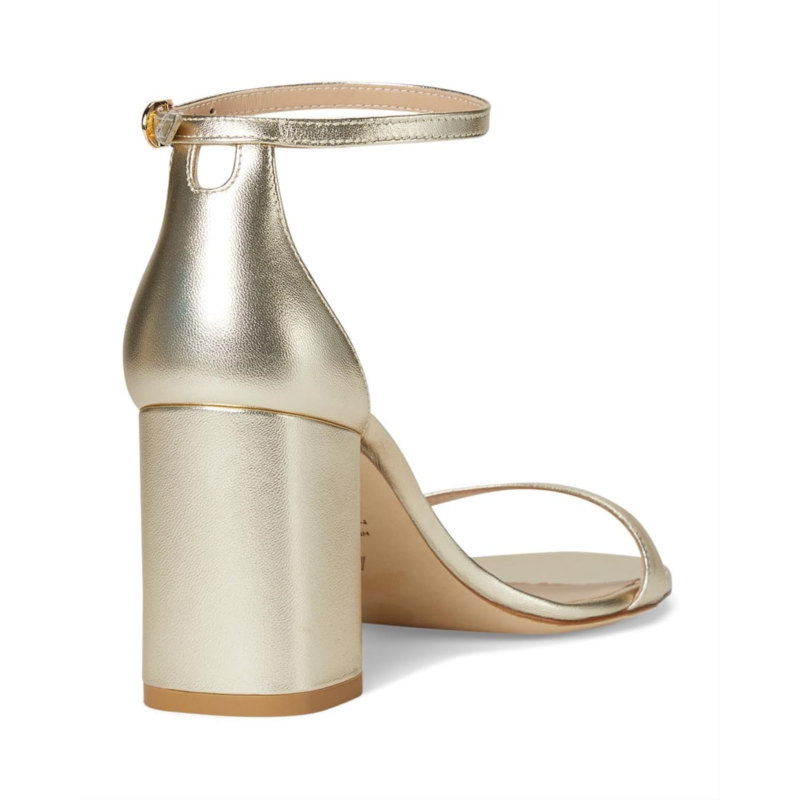 - Where style meets grace wear this beautiful footwear Nudist Block 75 by Stuart Weitzman Crafted with a sleek leather upper, lining, and insole, this stunning heel provides a sophisticated finish to any outfit. The stiletto heel adds the perfect amount of lift, while the buckle ankle strap ensures a secure and comfortable fit. With an open toe design, this shoe is your go-to for effortless glamor at every occasion.
