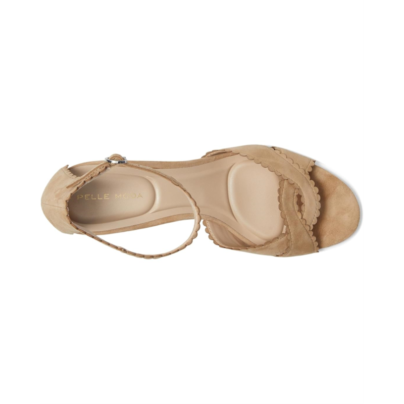 - The Pelle Moda Umelo heels are two-piece pumps with an open, round toe shape, and criss-cross upper straps with soft scallop details. These heeled sandals are designed with a padded footbed and faux leather lining. The suede upper features an ankle strap with an adjustable buckle closure. Walk with style wearing these chic sandals.