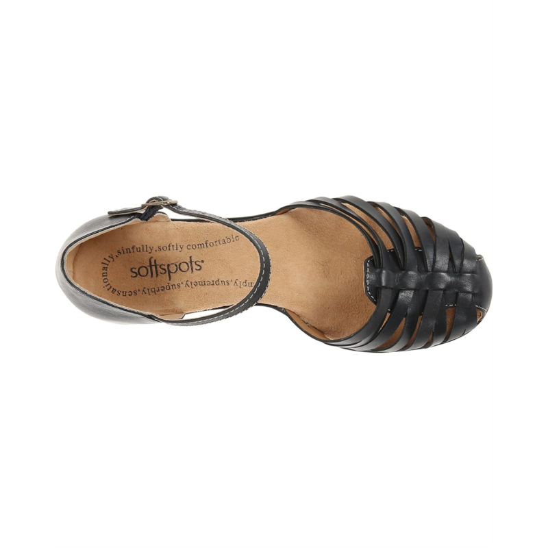 - Adjustable ankle strap with antique brass buckle for a personal fit.