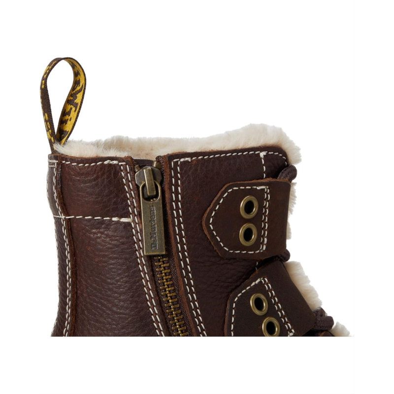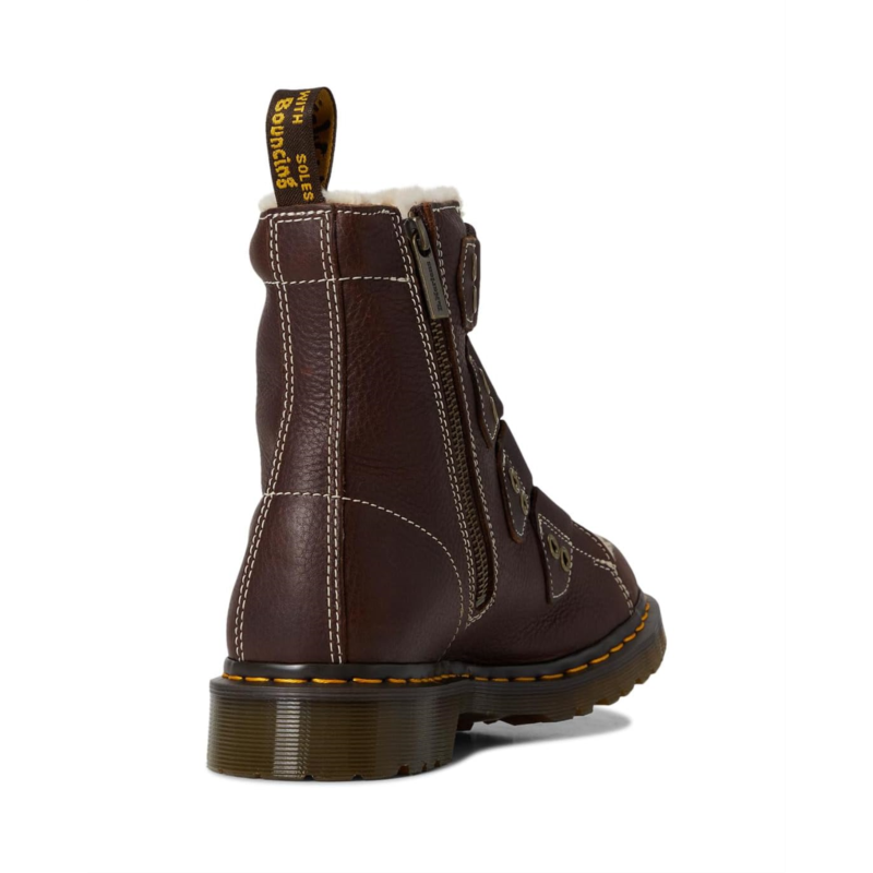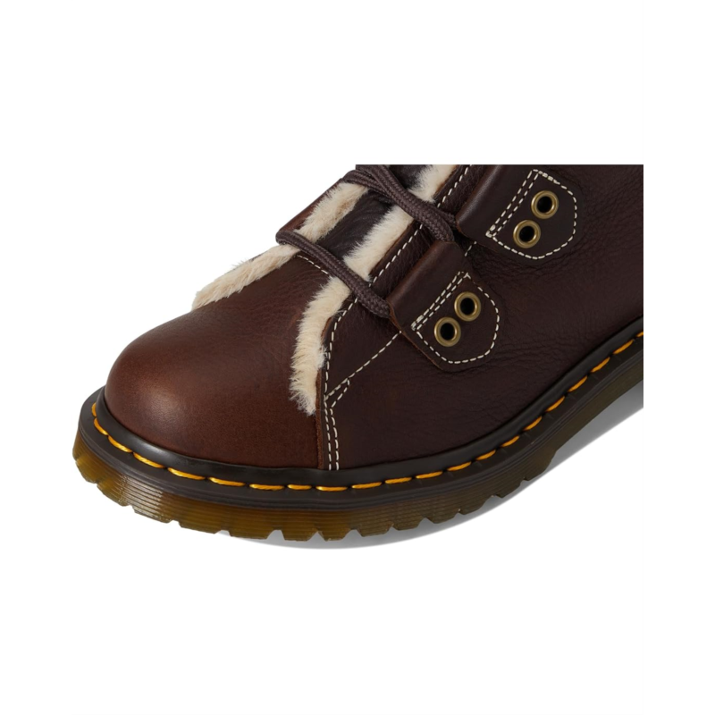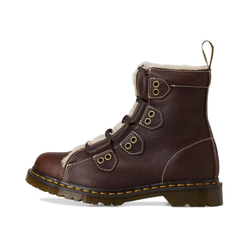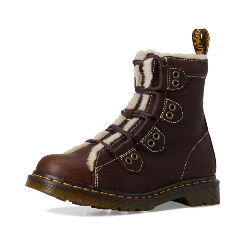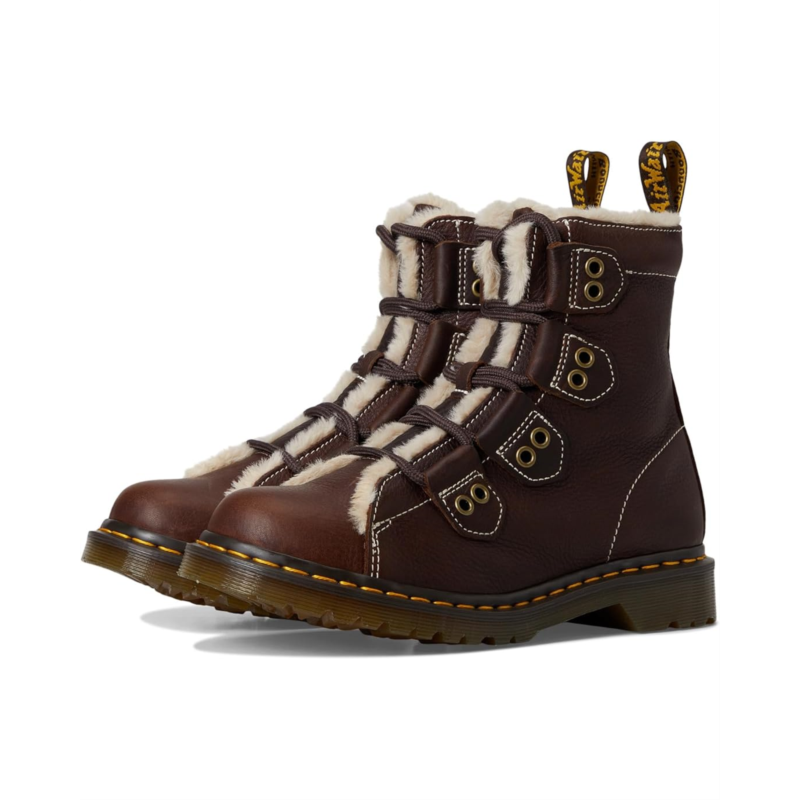- Built with toughness - lined for warmth. The Dr. Martens 1460 Ltt Fl boots in heavyweight Grizzly leather are engineered to embrace the colder weather. Pulling on the boots, their faux fur WarmWair lining cushions you from ankle to toe. These ankle-high boots are made of a polyester insole for cushioned comfort. The laces of these boots are woven down the upper alongside decorative antique gold trims. With contrast stitching across the silhouette, you''ll also find a brown and yellow branded heel loop and signature welt stitching. A trans BEN PVC outsole with classic grooving completes these lace-up boots.