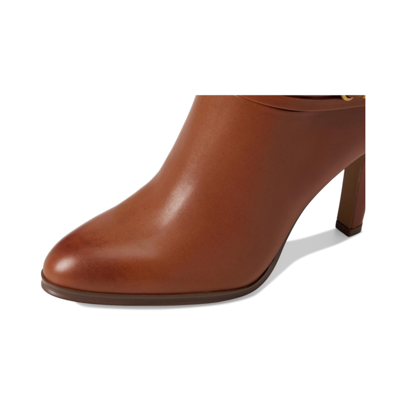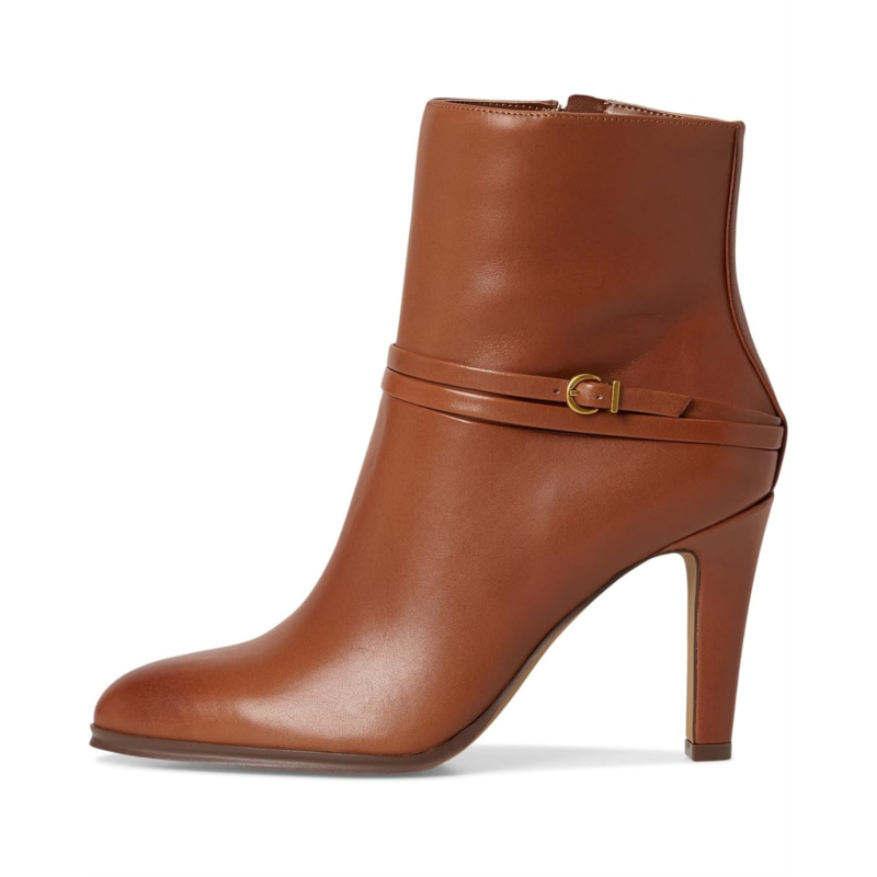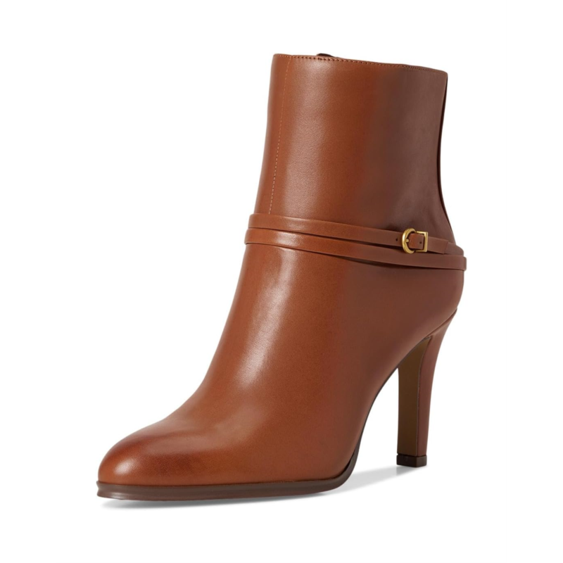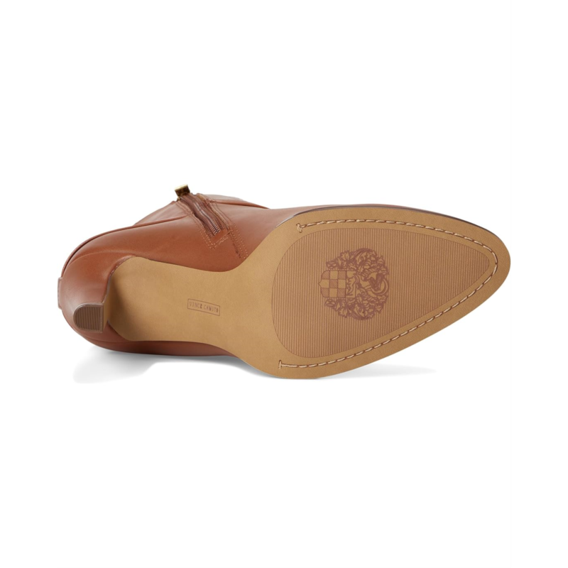 - The Vince Camuto Sybilla Double Strap High Heel Bootie is your go-to for polished power dressing with a feminine twist. Crafted with a luxe leather upper and smooth fabric lining, this ankle-high beauty is all about refined structure and everyday glam. The sleek almond toe, stiletto heel, and a pair of wraparound straps with metal-tone buckles add a subtle equestrian-inspired flair, perfect for turning sidewalks into runways. A side zipper ensures easy wear, while the rubber outsole keeps your stride confident.