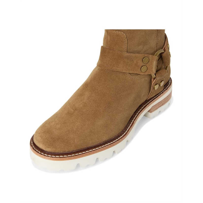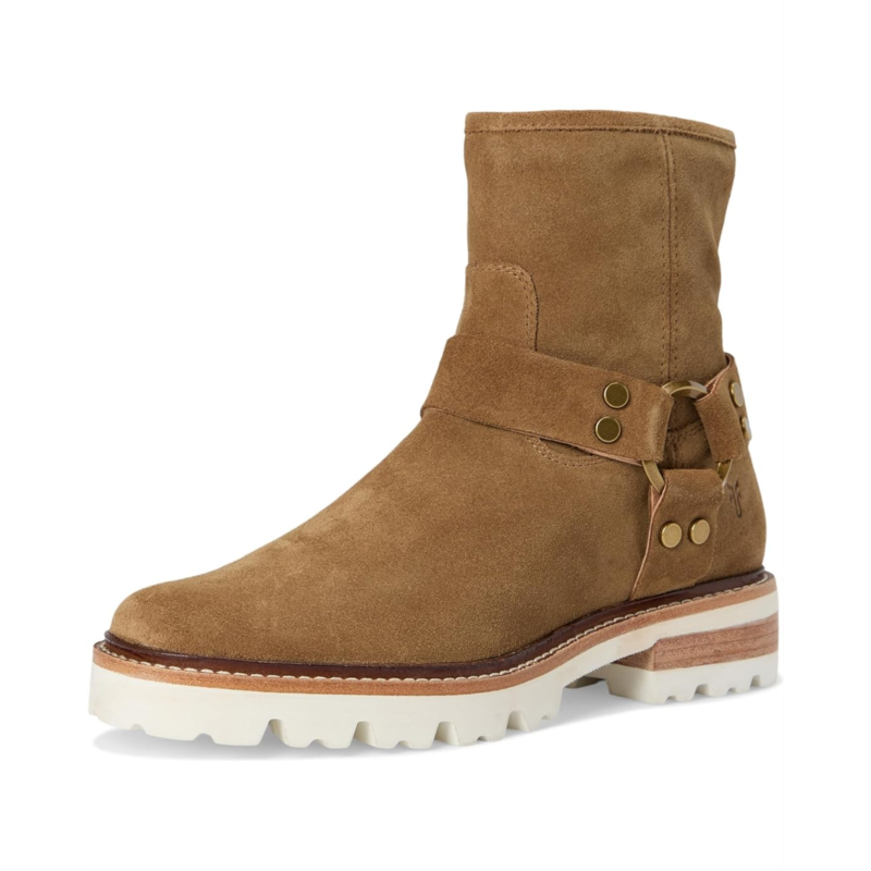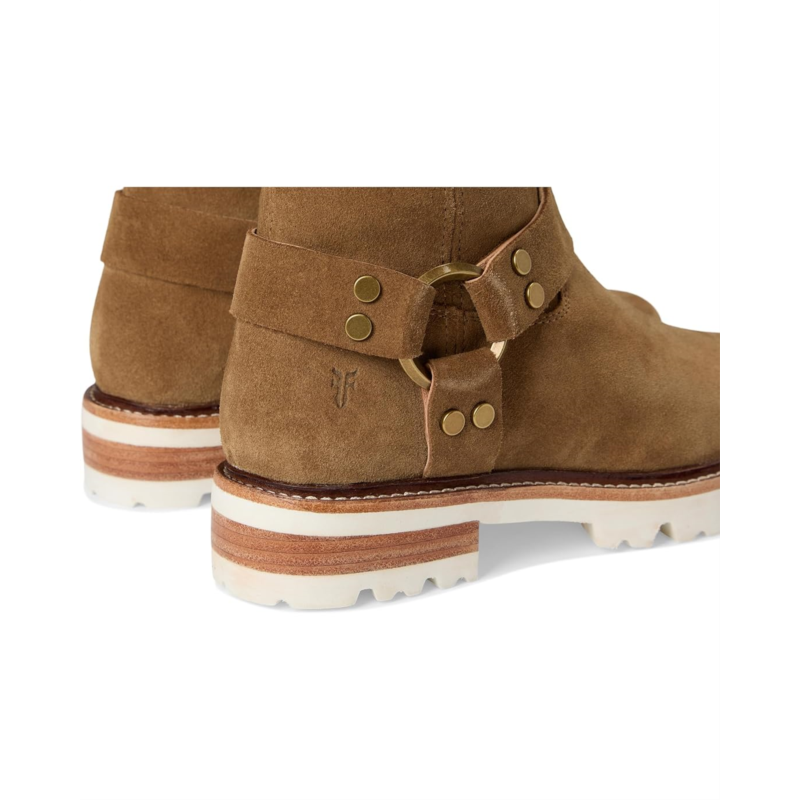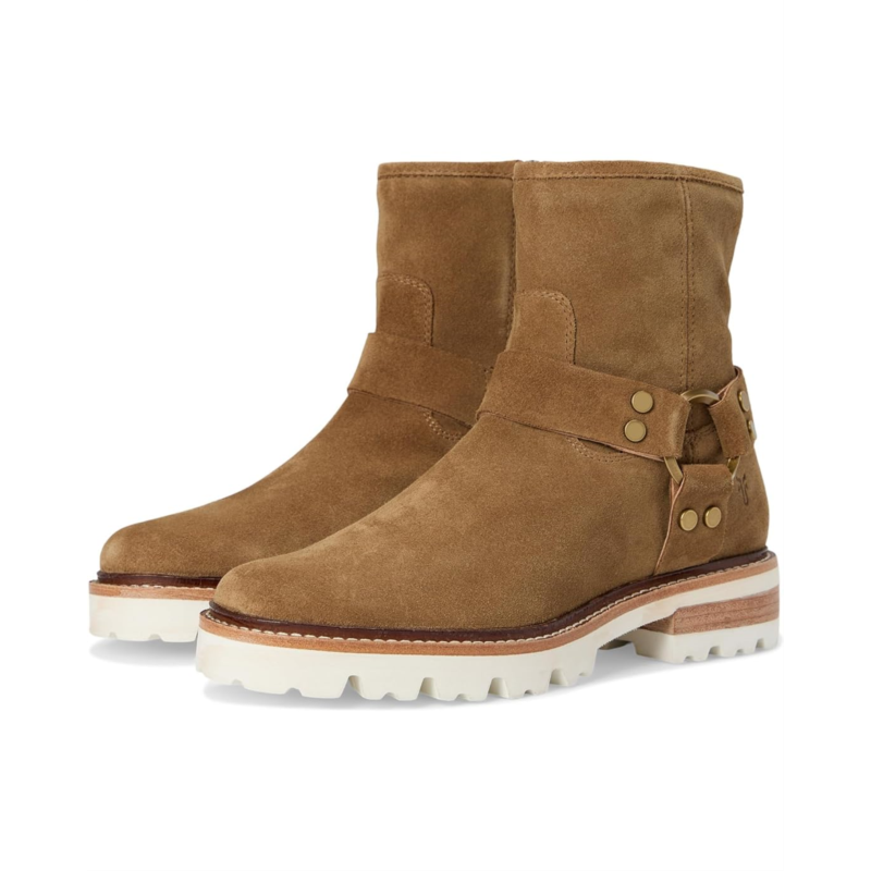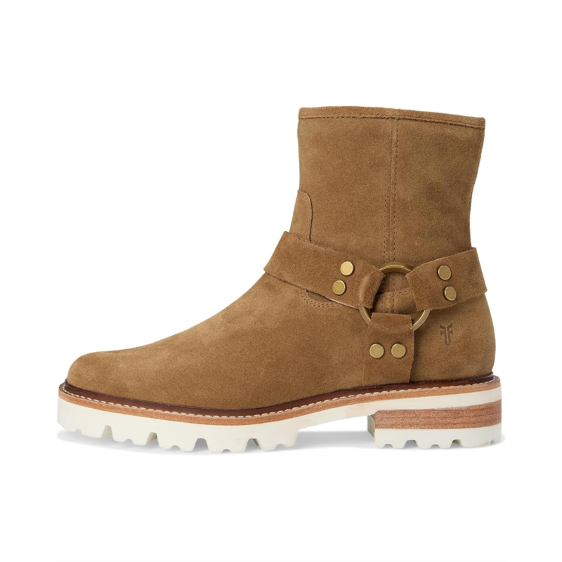 - The Frye Olivia Harness Short booties exude a playful aesthetic, yet elevate any ensemble their signature harness. Crafted from soft, smooth leather and suede upper, the chunky block heel provides both style and stability, while the durable EVA outsole ensures reliable traction and cushioning with every step.