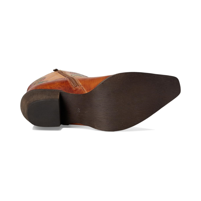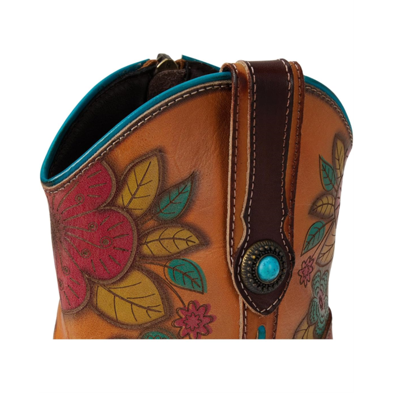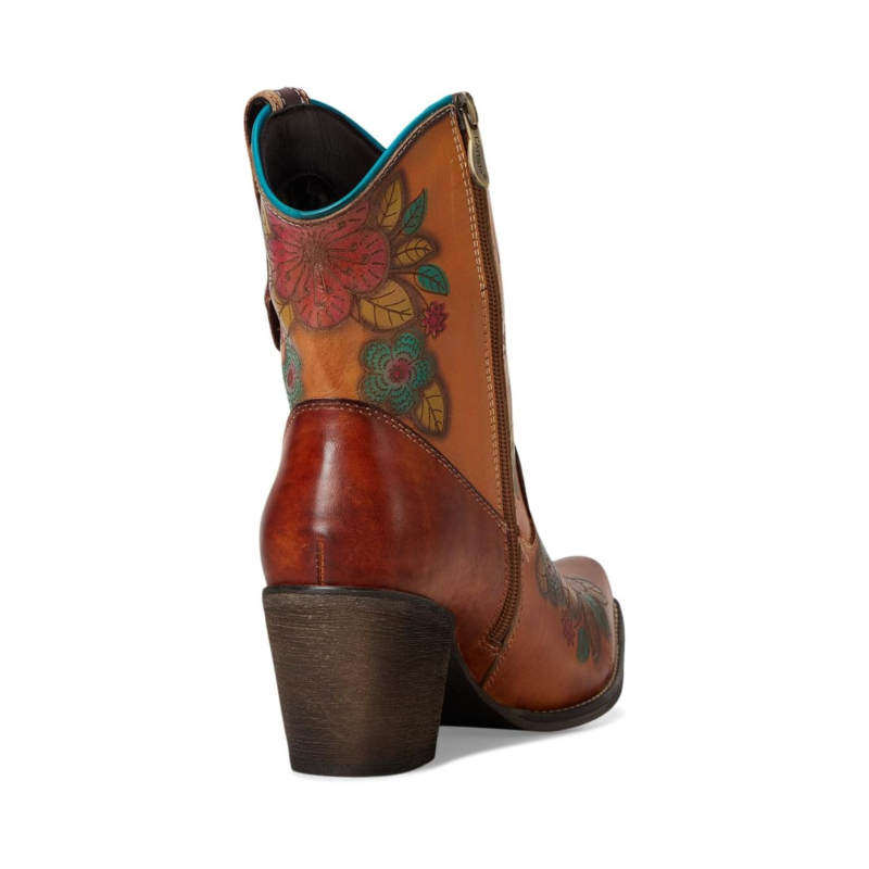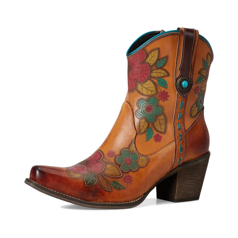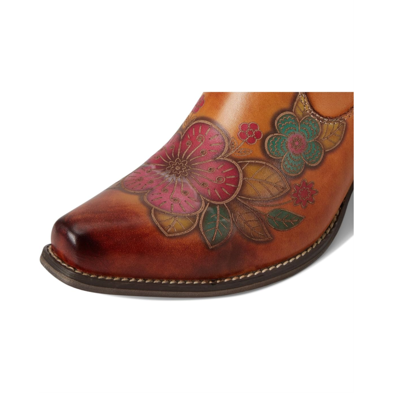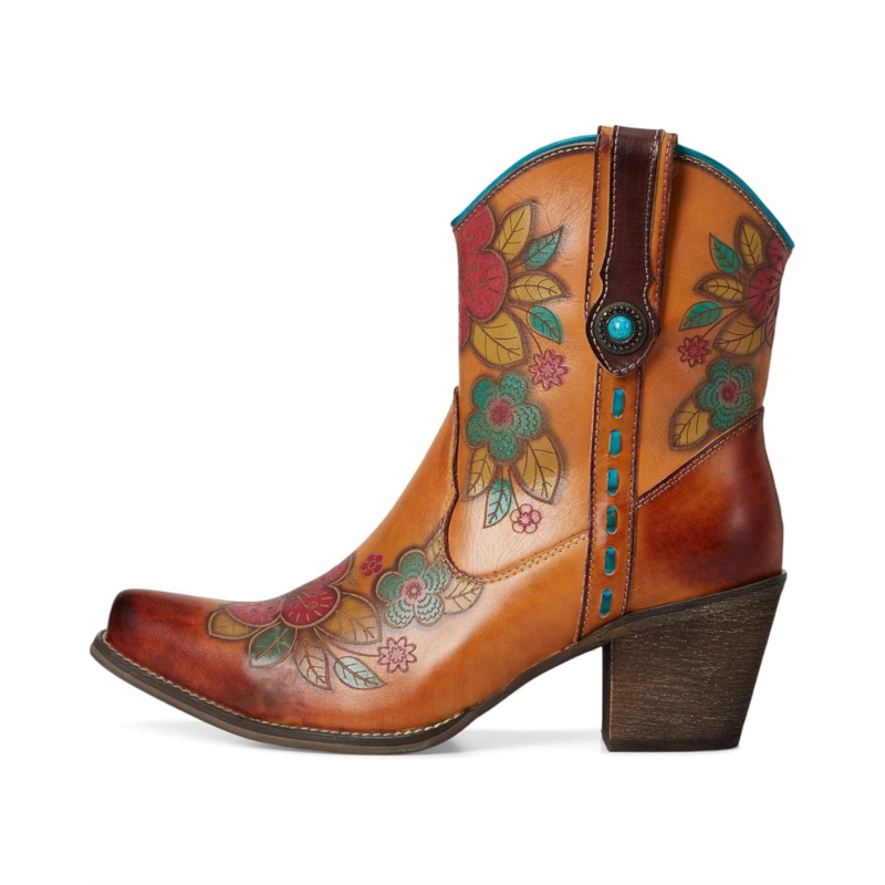 - Step into bold Western elegance with this stunning floral-embossed leather boot. Featuring a rich blend of hand-painted hues, intricate floral detailing, and classic cowboy-inspired stitching, this boot is the perfect mix of artistry and rugged charm. The pointed toe and faux stacked heel give it an authentic Western feel, while the side zipper ensures effortless wear. Designed for comfort with a cushioned insole, this boot is perfect for those who love to make a statement without compromising on wearability. Whether paired with denim or a flowy dress, this boot adds flair to any look.
