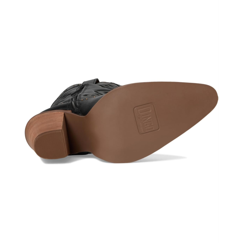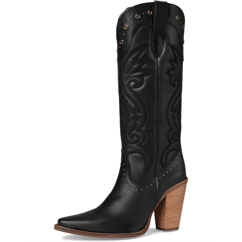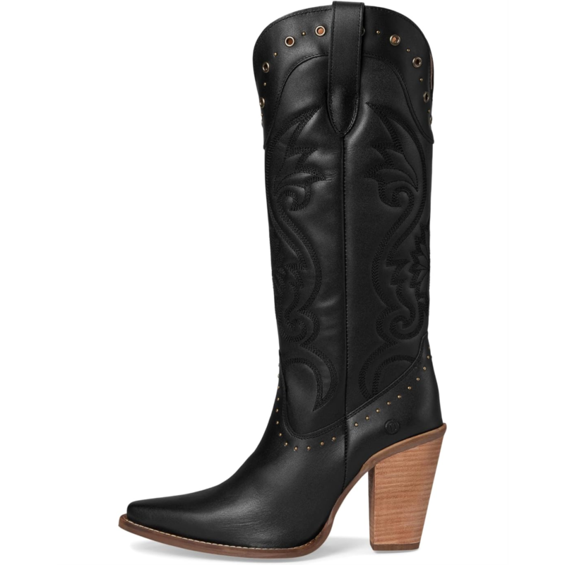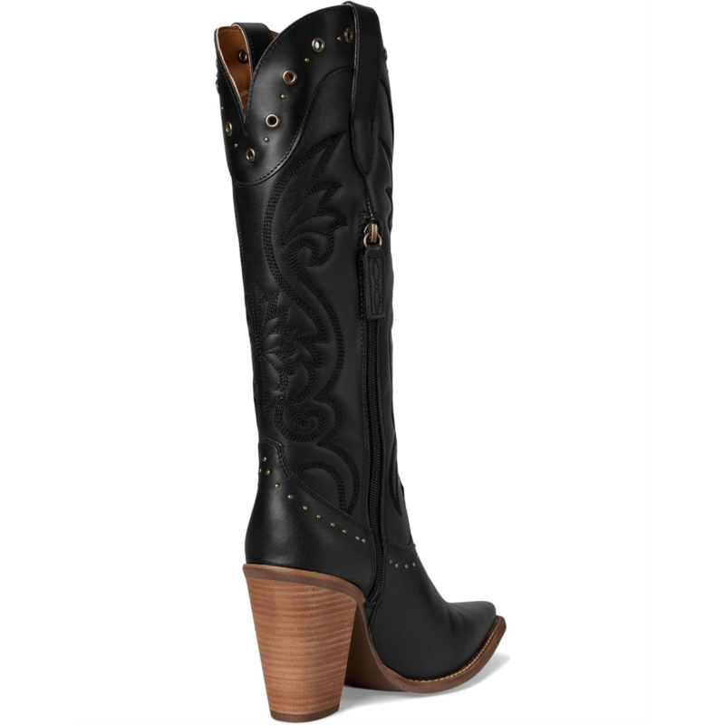 - Rock it your way styling Dingo Rock N'' Rebel. Crafted with a premium leather upper, it boasts puffed stitching, bold studs, and a sleek knee-high silhouette that screams confidence. The snip toe and block heel deliver a perfect mix of edge and elegance, while the foam insole ensures cushioned comfort that lasts from day to night. A smooth polyester lining and rubber outsole add durability and ease, complemented by a convenient zippered closure for effortless wear.