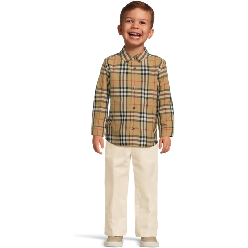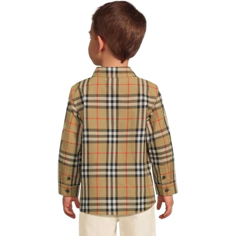 - The Burberry Kids Owen Check Long Sleeve Shirt features a spread collar with a front button closure and long sleeves with button closure cuffs. With allover Burberry Check, chest patch pocket and a curved hemline.