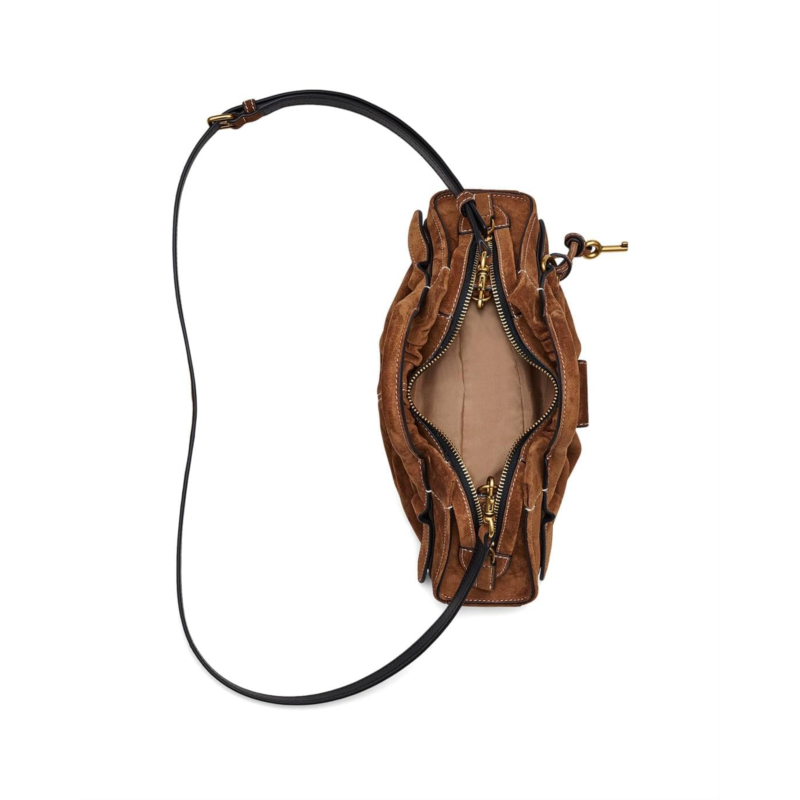 - Chic, versatile, and effortlessly cool: Marc Jacobs The Suede Dakota Small Satchel. Designed to elevate every outfit with its luxurious suede material and soft polyester lining. Compact yet surprisingly spacious, it features one main compartment and an additional pocket, keeping your essentials organized without the bulk. The secure zippered closure ensures peace of mind, while the top handle and adjustable crossbody strap offer multiple styling options. Carry it by hand for a polished look or sling it over your shoulder for hands-free ease.