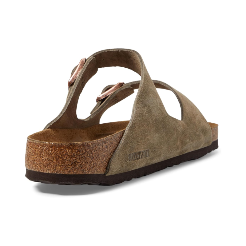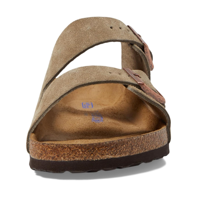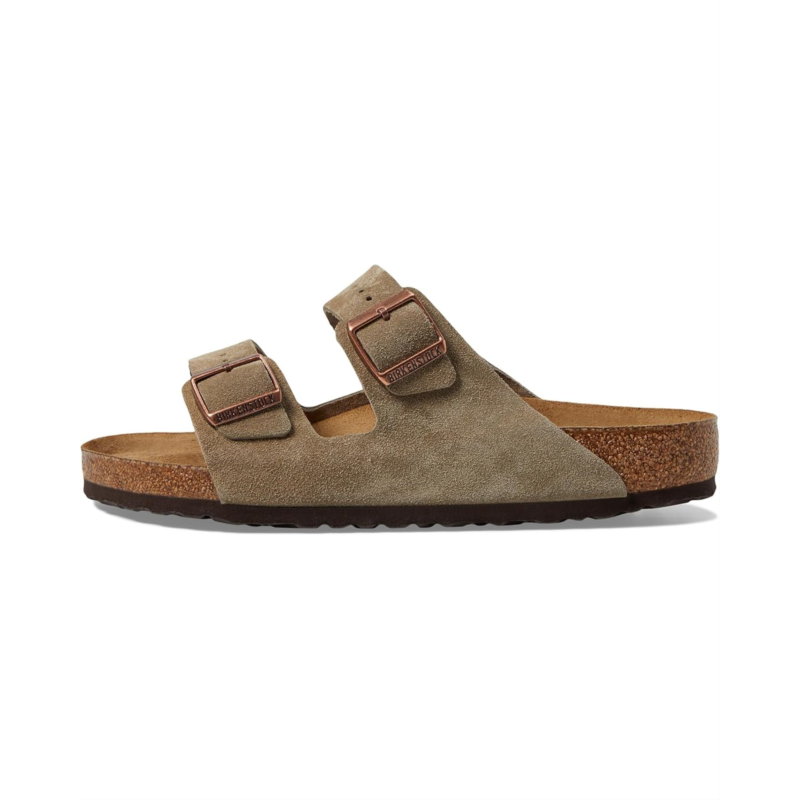 - The often imitated, never duplicated, category-defining, two-strap wonder from Birkenstock Arizona Soft Footbed Suede Leather Brown sandal. A comfort legend and a fashion staple. With adjustable straps and a magical cork footbed that conforms to the shape of your foot, a truly custom fit is as effortless as the classic design.