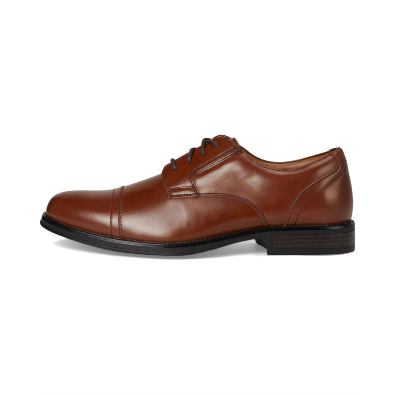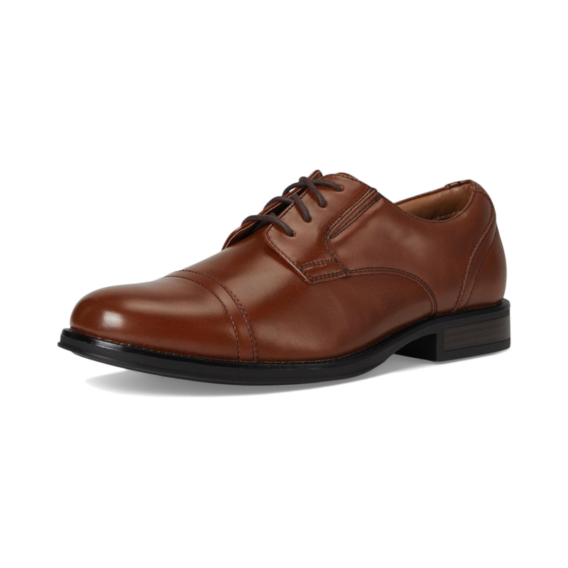 - Polished faux-leather uppers with a cap toe.