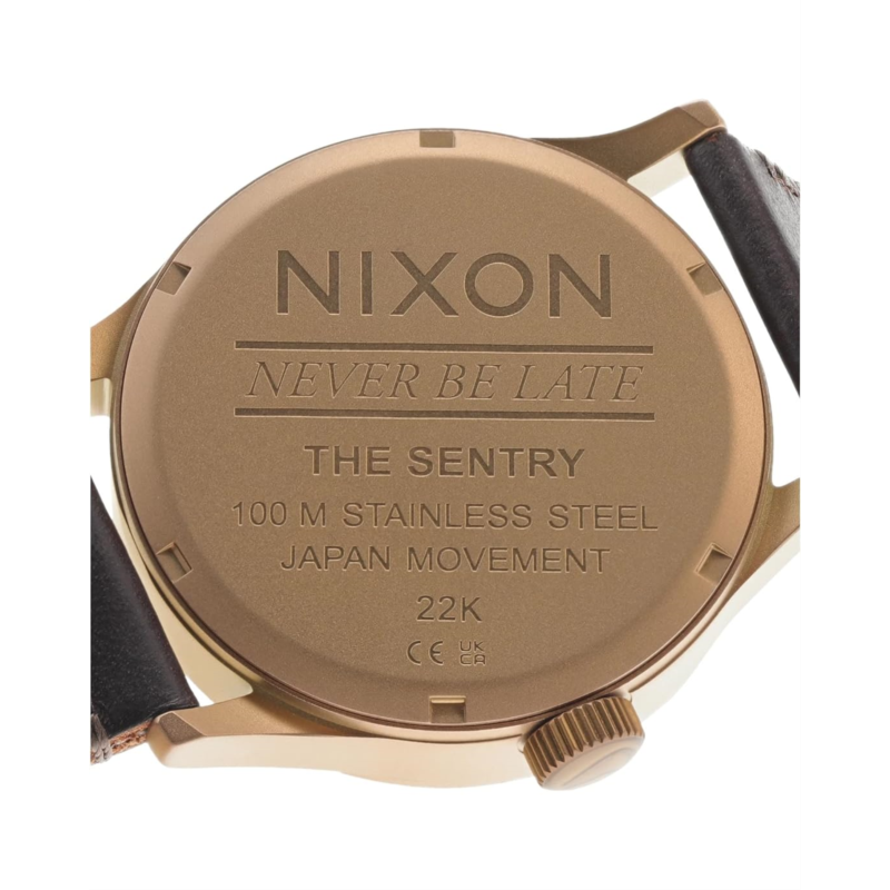- There''s no chain of command here; it''s all you with The Sentry Leather watch from Nixon. Featuring a custom solid stainless steel case, this watch offers a hardened mineral crystal, a triple gasket crown with enamel fill, stainless steel screw down caseback and spring pin lugs.