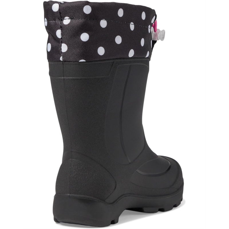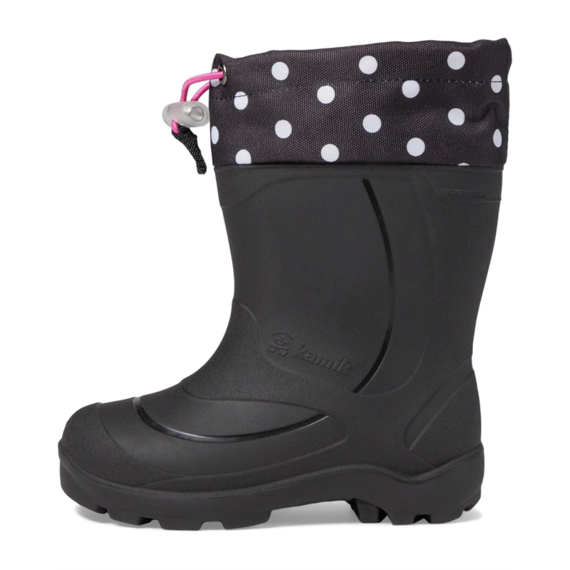 - The stylish and practical Kamik Kids Snobuster 2 Boots are perfect for long walks in winter. With a waterproof and recyclable lightweight synthetic RubberHe upper, the all-weather boot is perfect for walks in the snowy woods to a fall fishing trip. These vegan-friendly shoes come with polka dot detailing on the cuffs, polyester lining, rubber insole, and bungee closure.