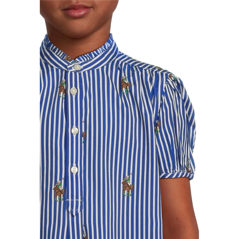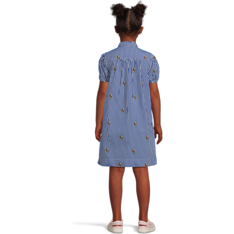 - In addition to classic stripes, this cotton poplin dress features a printed motif of the iconic Polo Bear playing his namesake sport atop the signature Pony. With short balloon sleeves with buttoned armbands, stand collar with ruffle trim and a four-button placket.