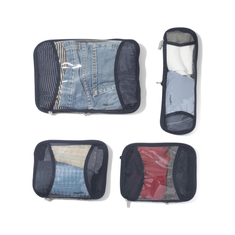 - Travel smart, pack chic, and stay effortlessly organized carrying the Baggallini Compression Cube 4-Piece Set! Whether youre jet-setting for a weekend escape or heading out on an extended adventure, these sleek, lightweight cubes transform your packing game. Crafted from durable nylon with a soft polyester lining, each cube is designed for hand-carry convenience and features four thoughtfully sized compartments to keep outfits, accessories, and essentials neatly separated. Mesh panels let you see whats inside at a glance, while compression zippers help you squeeze in more without the bulk.