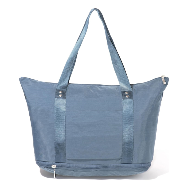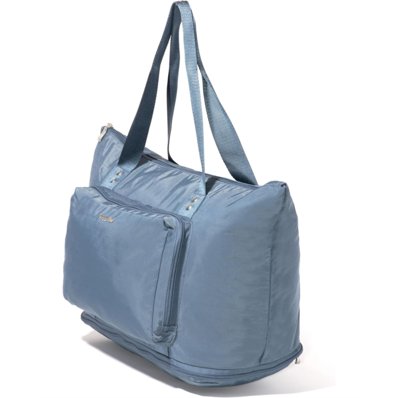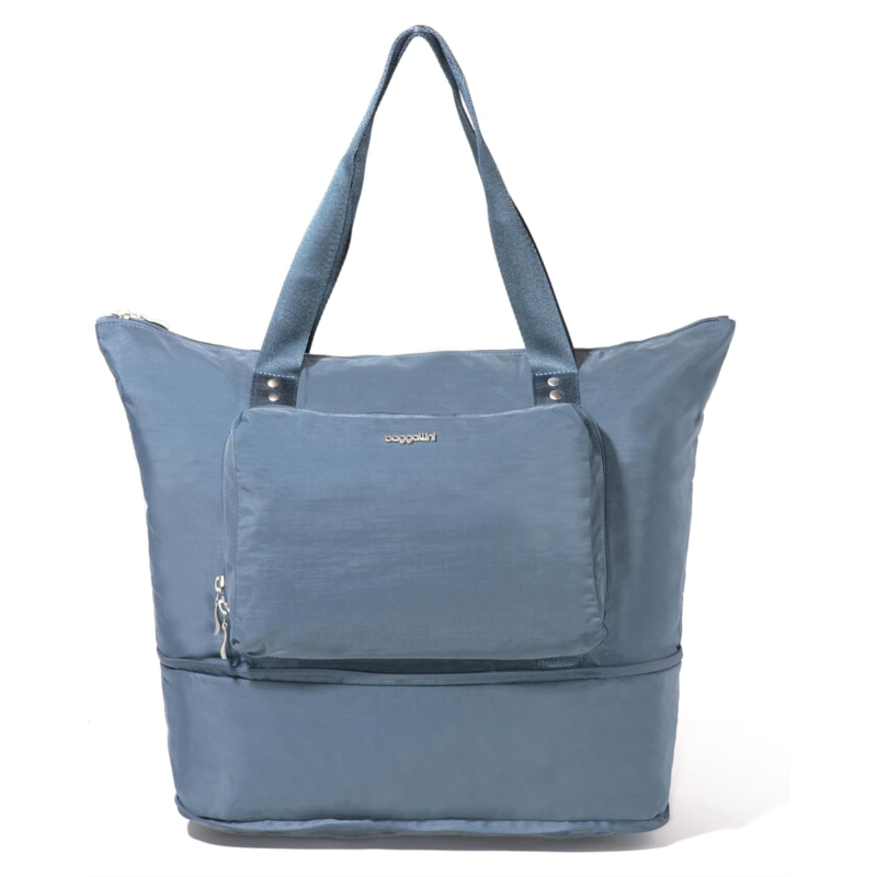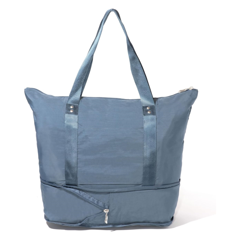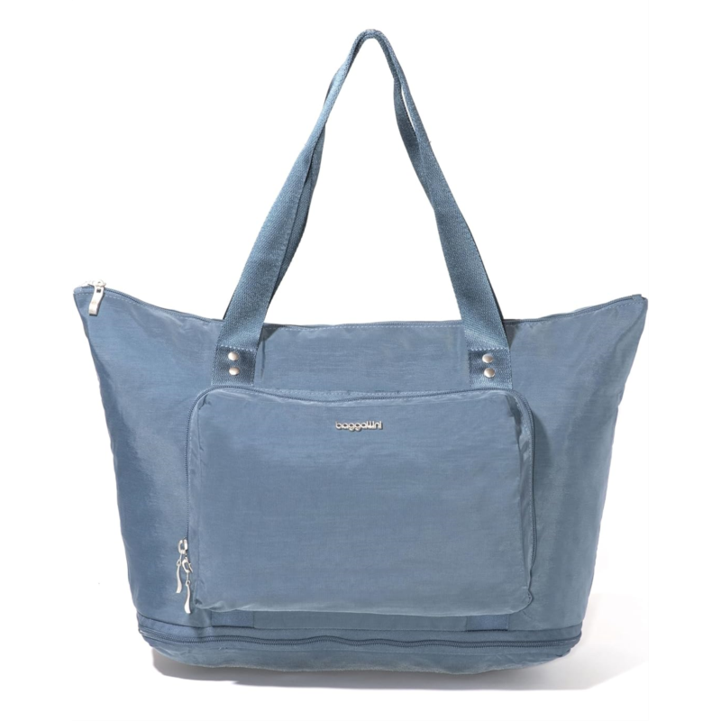 - Travel in style and ease by carrying the Baggallini Carryall Expandable Packable Tote. Crafted with a lightweight nylon construction, this water-resistant tote has an expandable design. Designed with a built-in travel sleeve, it effortlessly slips over your suitcase handle, making your journey a breeze. The zippered closure adds an extra layer of security, while the dual grab handles ensure comfortable and convenient carrying.