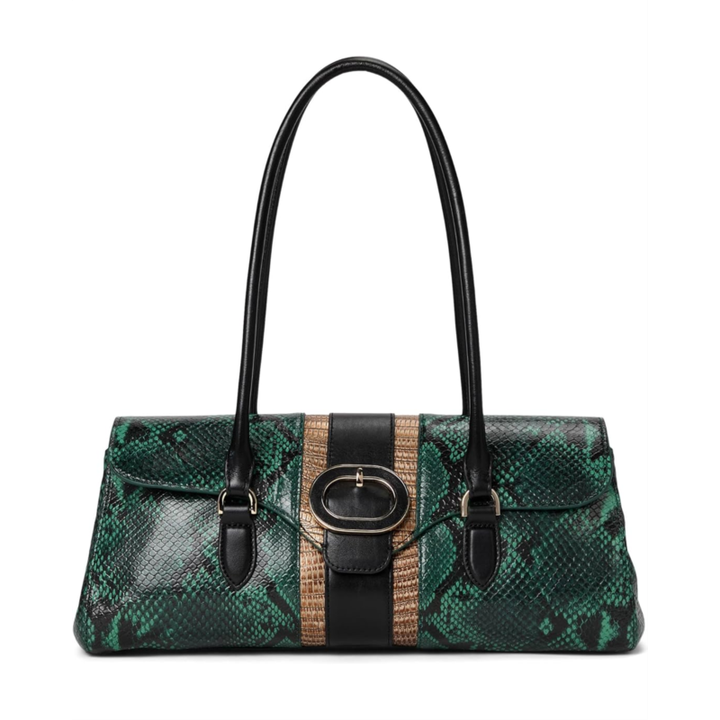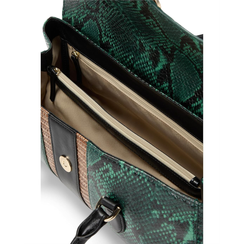 - The Brahmin Dayan handbag is a timeless accessory crafted with our signature croc-embossed leather construction. With its sleek design and dual, rolled grab handles, it effortlessly combines style and functionality. The magnetic turn-lock closure with flap ensures your belongings stay secure, while the spacious interior with double kangaroo pockets offers ample room for all your essentials.