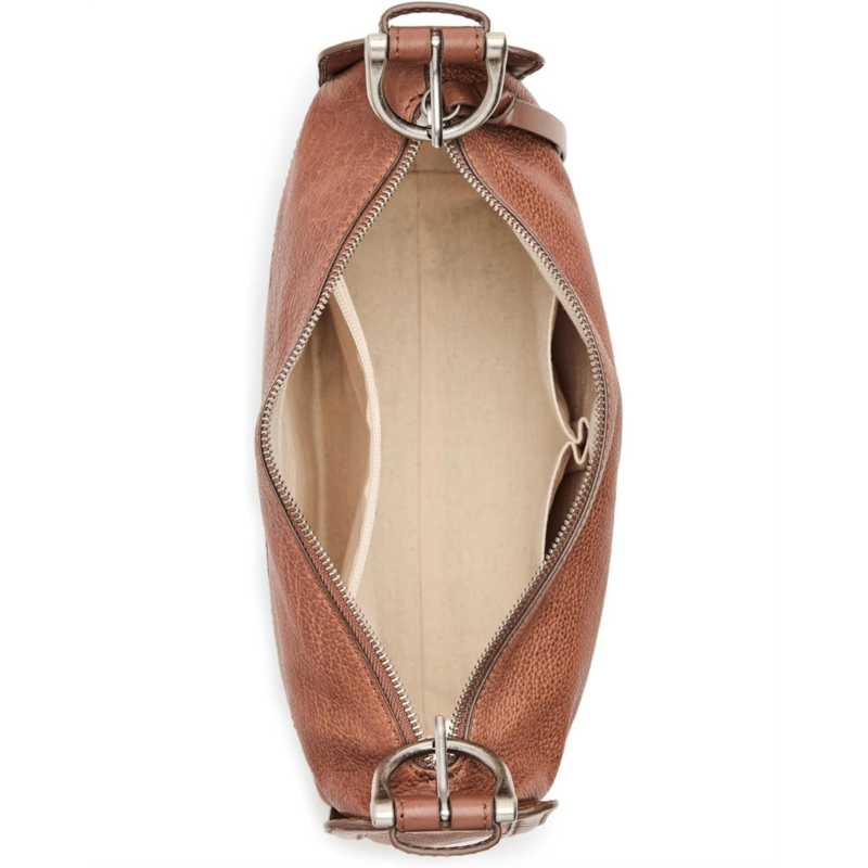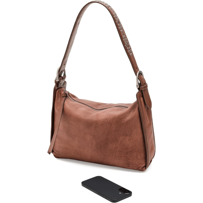 - The Frye Carla Studded Shoulder Bag is a statement piece made from premium leather and showcases studded detailing across the silhouette. Designed with a spacious interior and a zippered compartment, it offers everyday functionality with two additional slip pockets. The shoulder strap provides comfortable wear, making it versatile enough for both casual outings and elevated occasions.