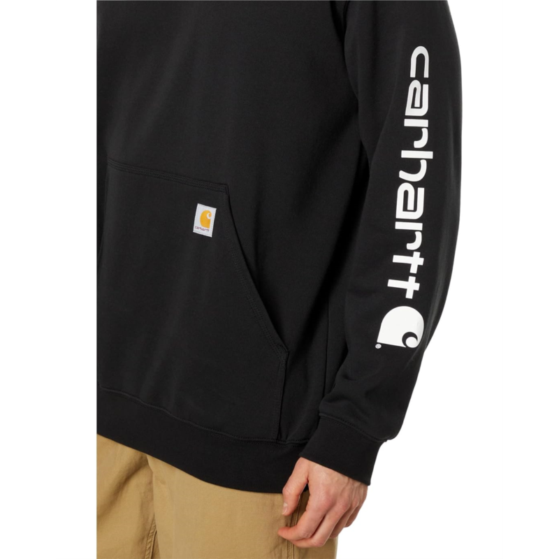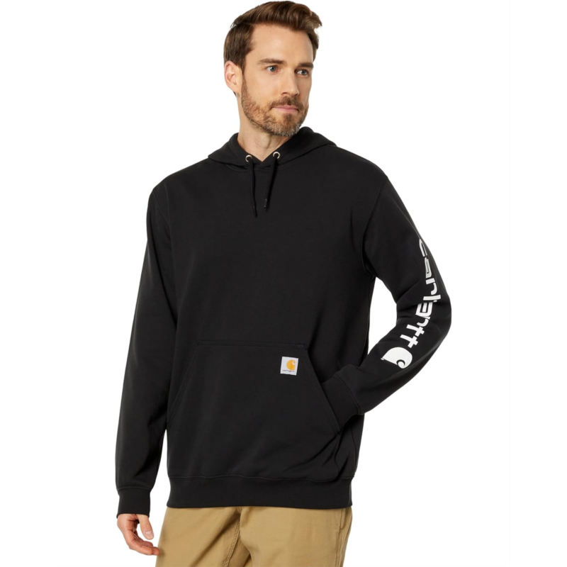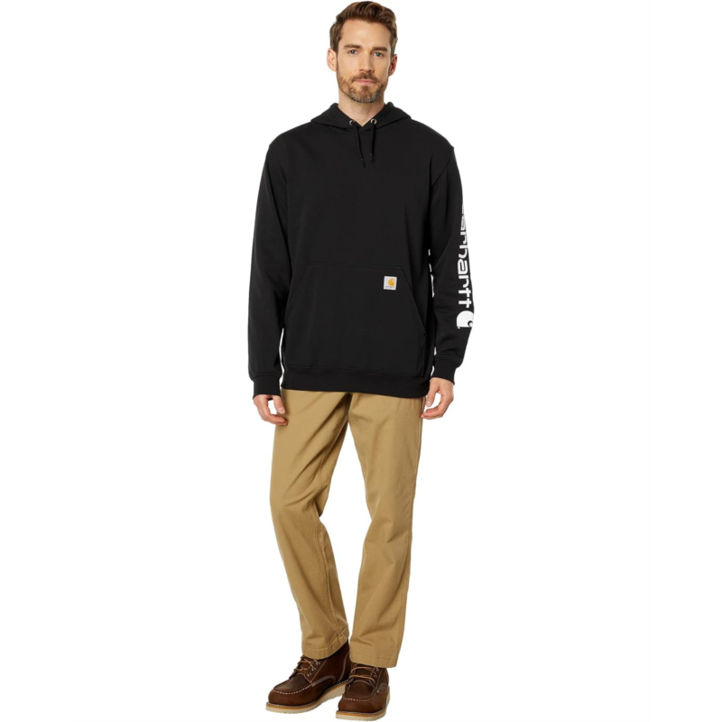 - Stay cozy and stylish in the Carhartt Loose Fit Midweight Logo Sleeve Graphic Sweatshirt! This trendy hooded sweatshirt features a pull-on design with long sleeves and a convenient kangaroo pocket. The attached three-piece hood with drawcord closure ensures a perfect fit, while the front handwarmer pocket keeps your hands toasty. Stretchable, spandex-reinforced rib-knit cuffs and waistband provide added comfort and flexibility. The iconic Carhartt signature logo printed on the left sleeve and label sewn on the pocket add a touch of rugged charm.