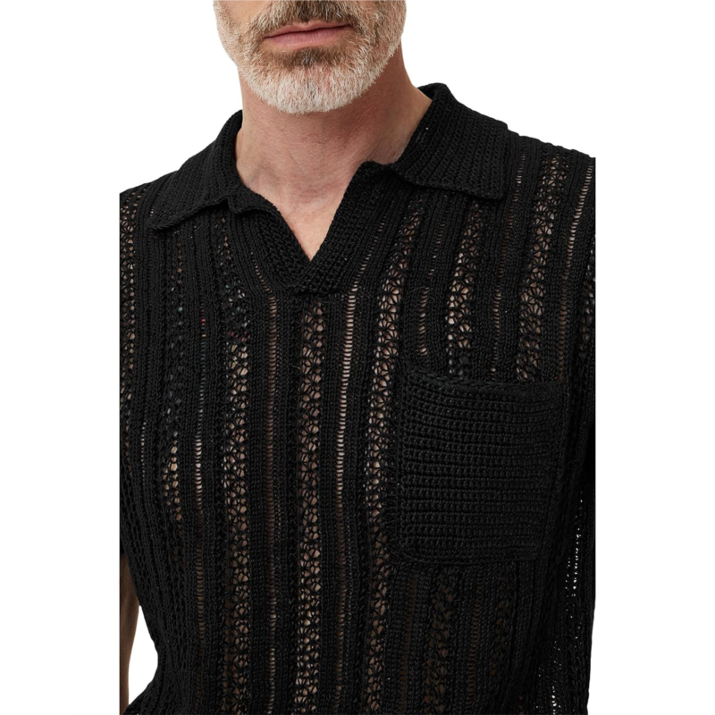 The John Varvatos Odin Linen Sweater Polo Y2317S25 is an artful blend of elegance and craftsmanship. Made entirely from French linen, it features a unique variegated pointelle texture that adds depth and charm to its design. A crocheted collar and detailed patch pocket showcase artisanal touches, while ribbed cuffs and hem provide a refined finish. This short-sleeve sweater is elevated further by the signature flag label.