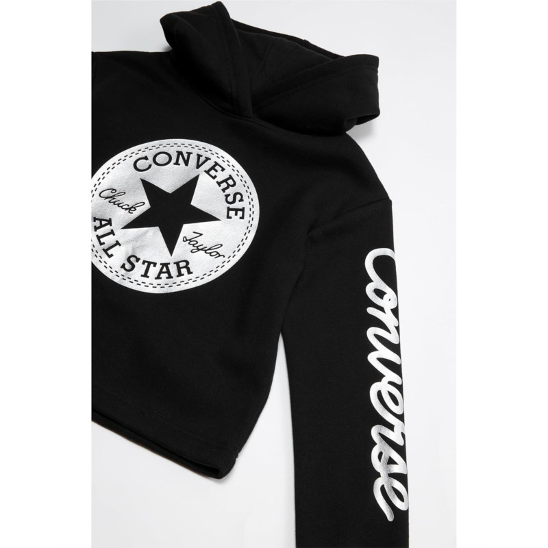 This Converse Kids Fleece Signature Cropped Foil Graphic Hoodie sports a cotton-blend knit and shows off the brand logo at center and left sleeve for a comfy and old-school appeal.