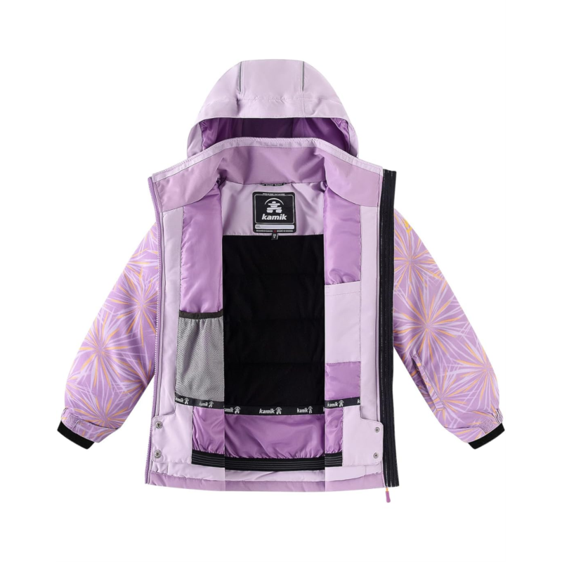The Kamik Kids Lyra Jacket is the ultimate companion for little explorers braving chilly days and snowy escapades. Crafted with high-quality polyester and premium insulation, it keeps your child warm while taped seams and a waterproof front zipper with chin protector block out wind and moisture. Safety meets style with reflective 3M Scotchlite piping and prints, ensuring visibility even at dusk or in low-light conditions. Designed with practicality in mind, the Lyra offers a detachable and adjustable hood, two zippered side pockets, an internal MP3 pocket, a mesh pocket, and a convenient ski card pocket. ''Grow-with-you'' cuffs, inner Lycra cuffs with thumb loops, and an elasticized drawstring with hook-and-loop fastening ensure a perfect fit through every adventure. With YKK zippers and clever storage solutions, this classic-fit jacket combines warmth, comfort, and functionality, making every winter day a playful, worry-free adventure for your child.