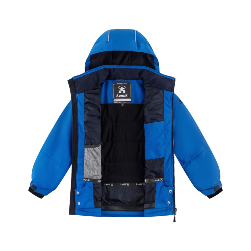 Keep them warm and dry on the mountain in the Kamik Kids Hux jacket. Featuring a bionic finish eco water repellant coating making the jacket perfect for rainy days. The full sleeves jacket features all polyfill insulation, 3m reflective details for safety, a snow skirt with gripping elastic, a detachable hood, and spandex knit cuffs.