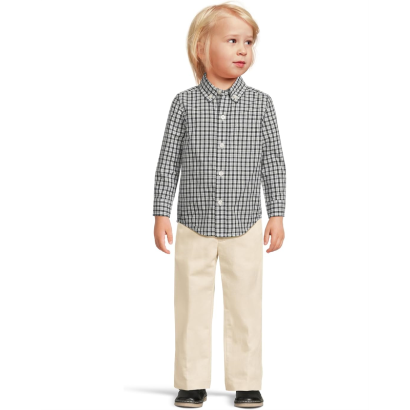 The Janie and Jack Plaid Poplin Button Down Shirt features an allover plaid pattern, making it a great choice to get your kid ready for parties and events. Its buttoned front closure ensures easy wear. This plaid shirt is designed with long sleeves, buttoned cuffs, a collared neckline, and a shirttail hem.