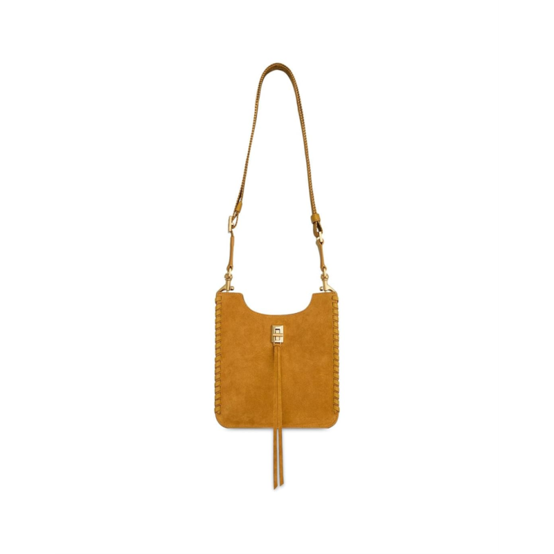 Chic meets charm in the Darren Whipstitch Mini Feed by Rebecca Minkoff- your new go-to for effortless style with a boho twist. Crafted from luxe leather with eye-catching whipstitch trim and playful front tassels, this mini feed bag brings just the right edge to your everyday look. Its three spacious compartments and two handy pockets keep your essentials organized, while the interior slip pocket adds a secure space for valuables. The sleek crossbody strap gives you hands-free freedom, and the antique brass twist-lock closure offers a timeless touch.