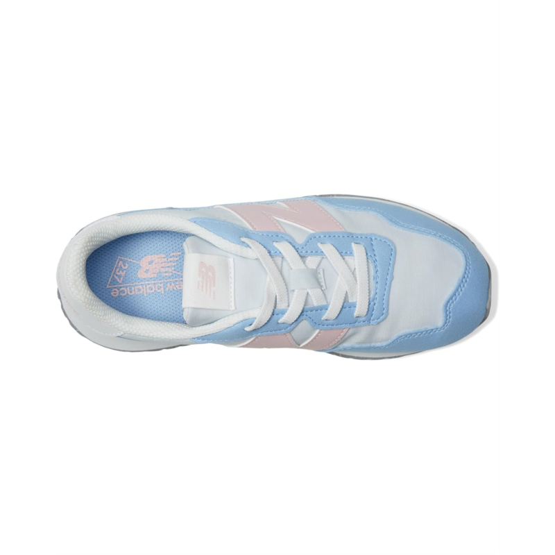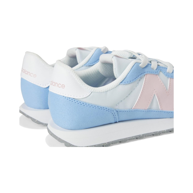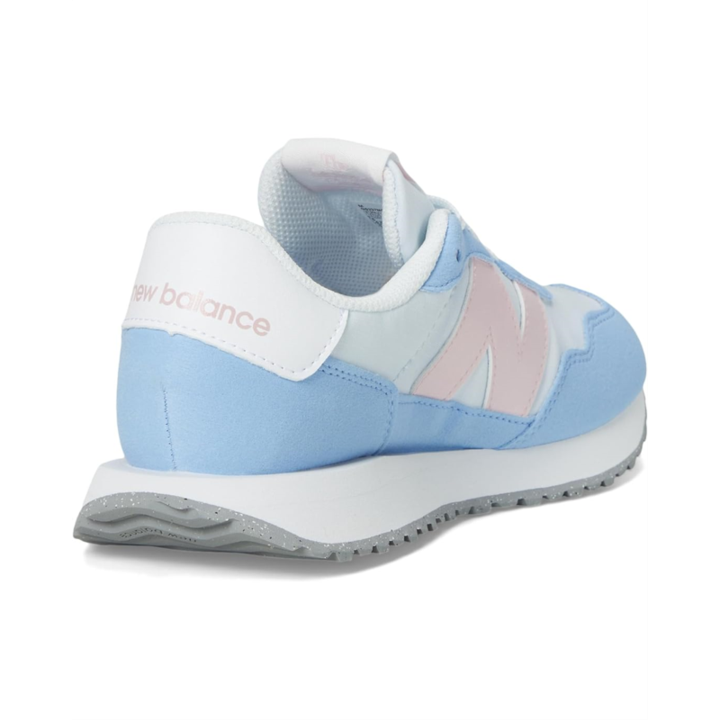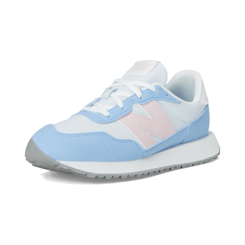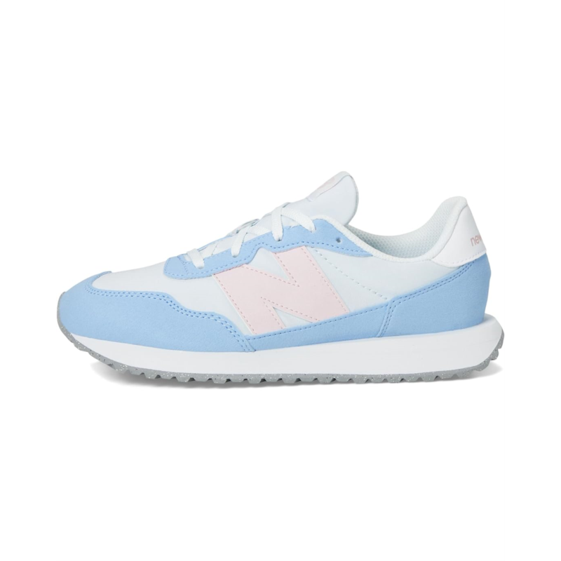 - Taking design cues from 1970s archival favorites, the New Balance Kids 237 Bungee Lace shoes meld heritage influences with a modern outlook. They utilize an EVA midsole, herringbone rubber outsole, and streamlined mesh upper as a classic launching point, with modern flourishes like oversized N branding, extended midsole length, gator-inspired foxing, and mudguard offering a modern take on the decade when running shoes truly made their mark for the first time. Their asymmetric rubber tip wrap adds to their comfort. Experimental in spirit yet easily accessible, these lace-up shoes are deceptively simple, a contemporary statement piece and are designed for growing feet.