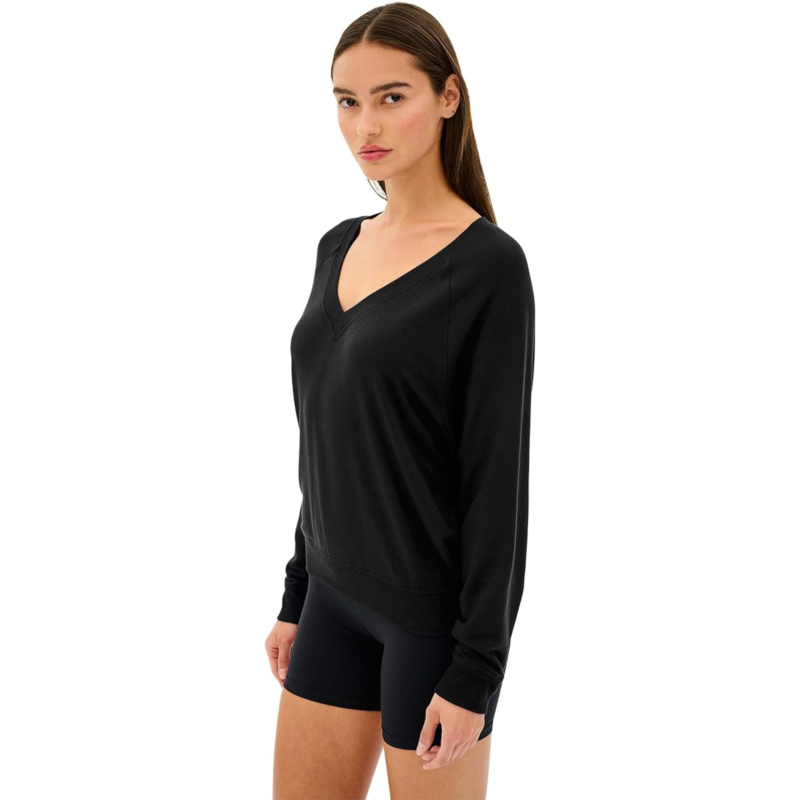 The Splits59 Bennie Fleece V-neck Sweatshirt is a super-soft fleece V-neck sweatshirt with white cross-stitching. Made from a comfortable Modal blend fabric, this pullover sweatshirt takes your comfort to the next level. It comes with long sleeves, ribbed cuffs, and a ribbed hem.